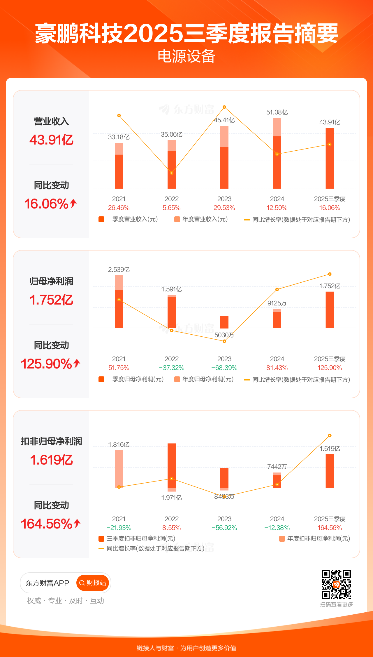 豪鹏科技10月30日发布2025年三季报显示,公司前三季实现营业收入43.91亿元,同比增长16.06%;归母净利润1.75亿元,同比增长125.90%;扣非归母净利润1.62亿元,同比增长164.56%。