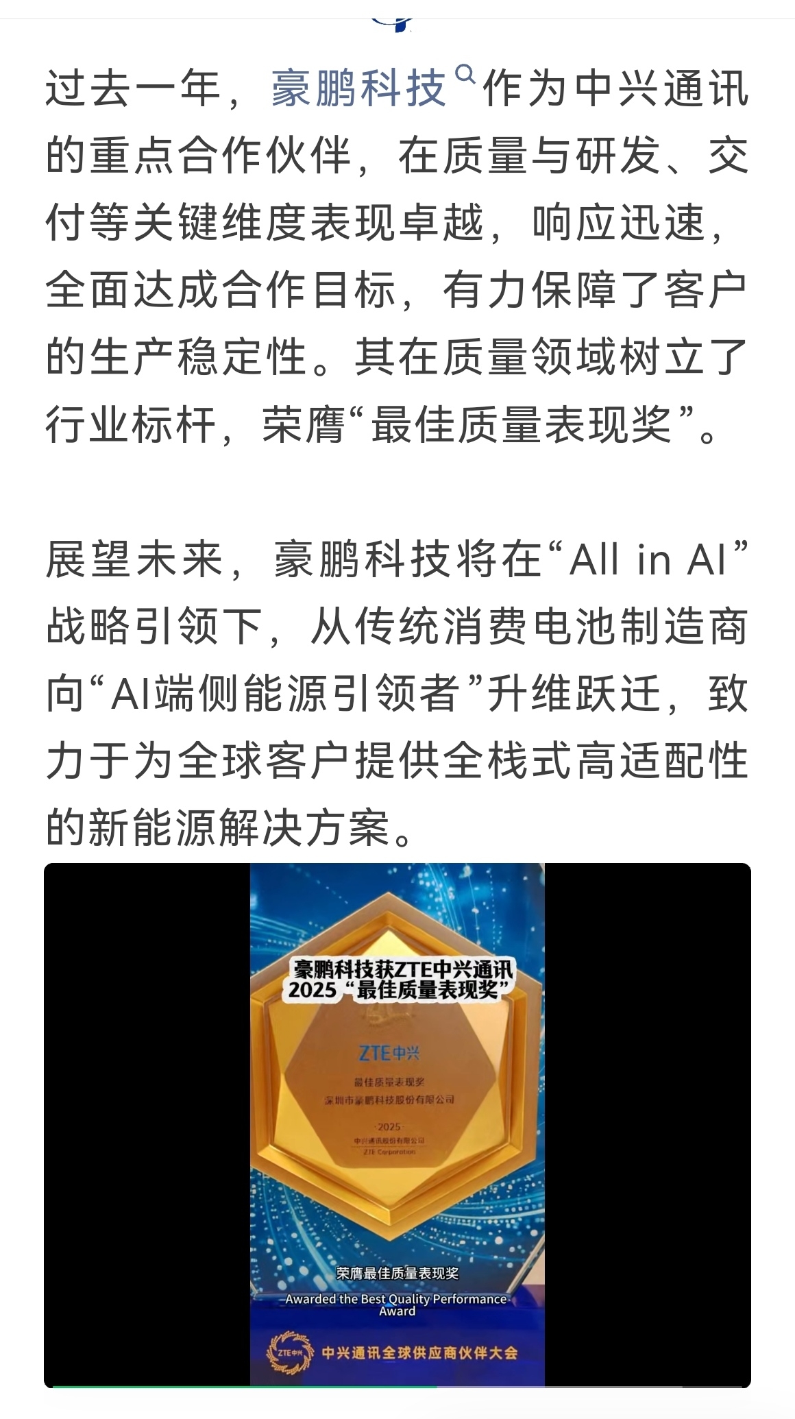 $豪鹏科技(SZ001283)$ 这公司也挺会蹭热点,今天中兴的豆包AI手机火了,豪鹏的公众号就推送一篇中兴通讯质量奖的文章