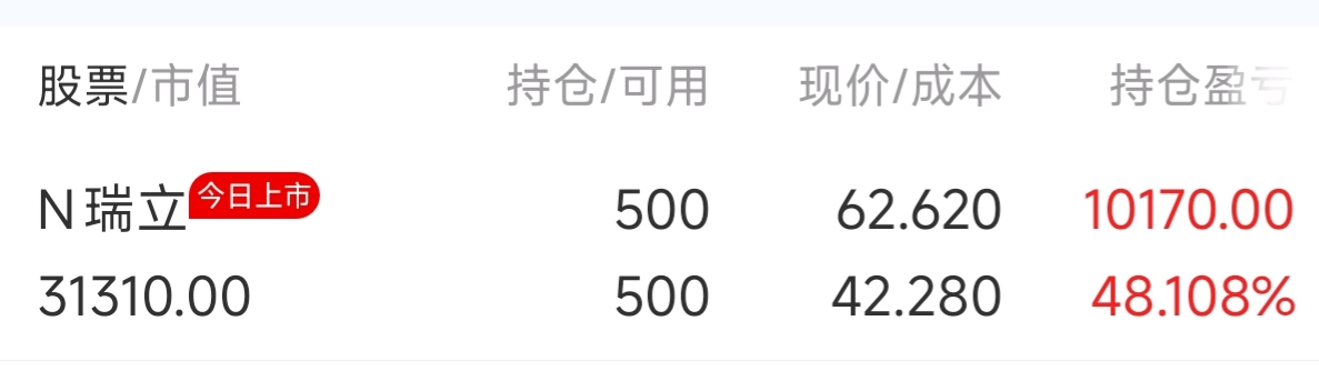 $N瑞立(SZ001285)$ 67%都算做卖盘才从80%收益降到48%,就算开盘全部卖完加融券我打新都会有收益,根本不慌。这就只是我一个月工资,反正卖是不可能卖的