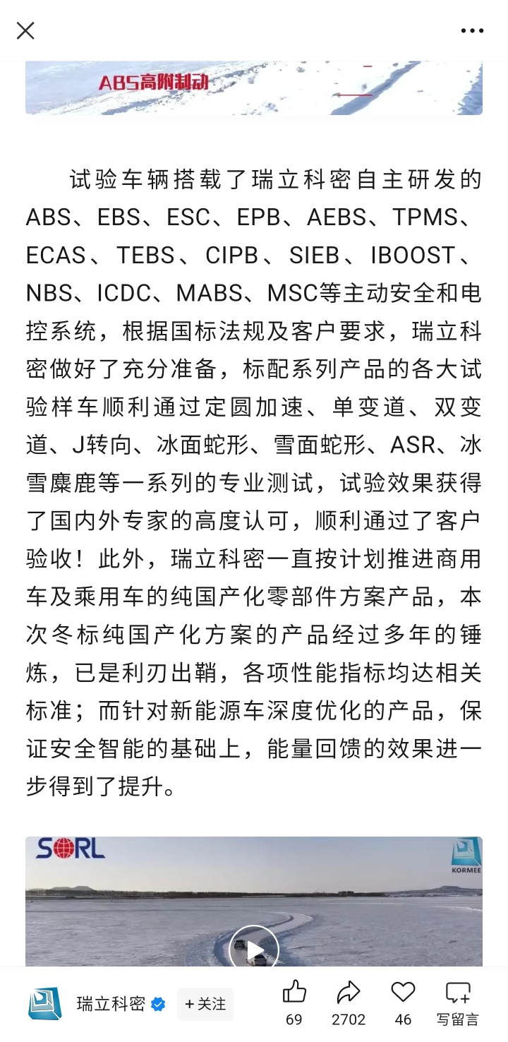瑞立科密一直按计划推进商用车及乘用车的纯国产化零部件方案产品