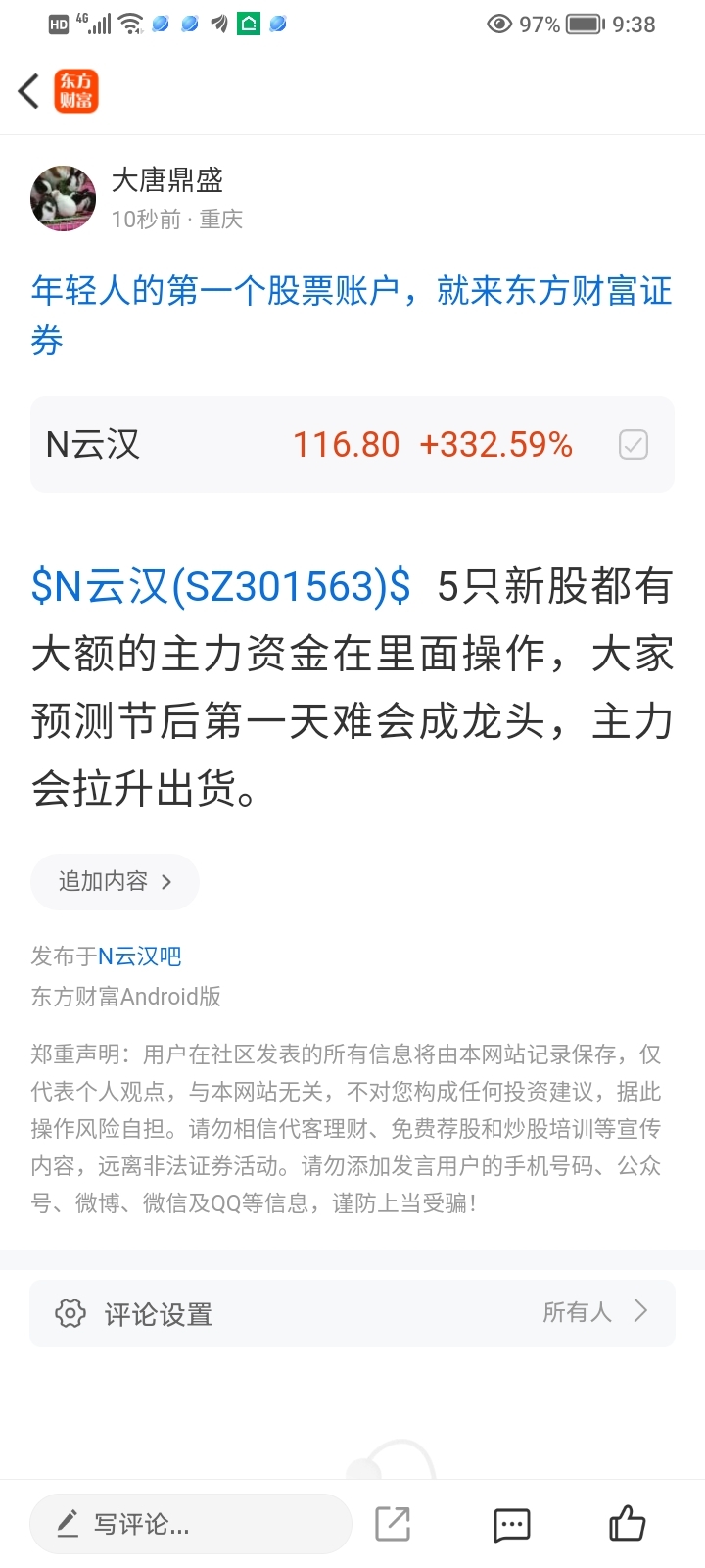 温馨提示: 1.根据《证券法》规定,禁止编造、传播虚假信息或者误导性信息,扰乱证券市场;2.用户在本社区发表的所有资料、言论等仅代表个人观点,与本网站立场无关,不对您构成任何投资建议。用户应基于自己的独立判断,自行决定证券投资并承担相应风险。《东方财富社区管理规定》