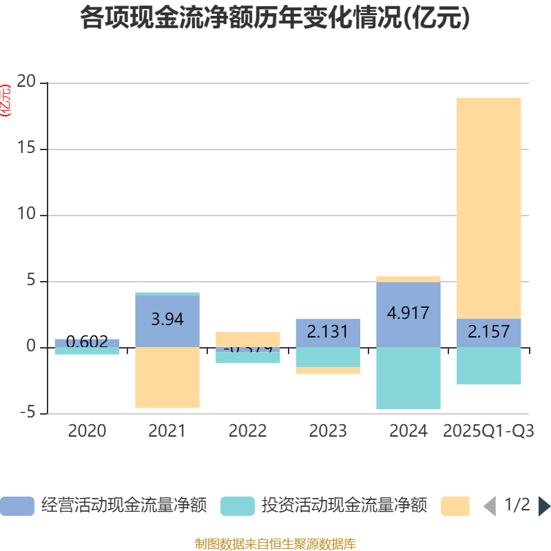 2025年前三季度,公司经营活动现金流净额为2.16亿元,同比下降27.59%;筹资活动现金流净额16.7亿元,同比增加15.8亿元;投资活动现金流净额-2.81亿元,上年同期为-3.35亿元。