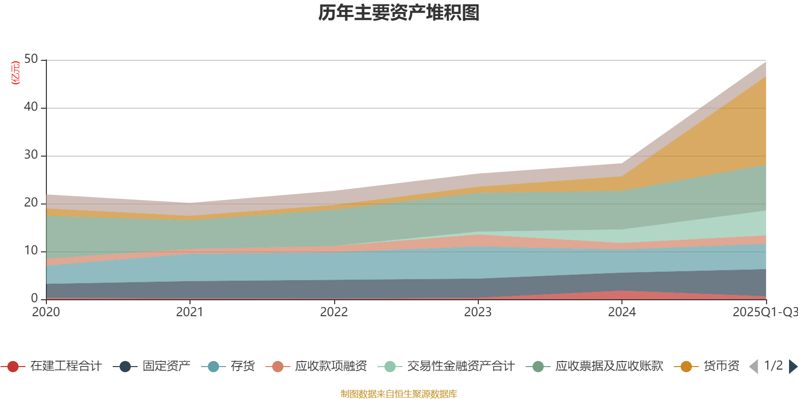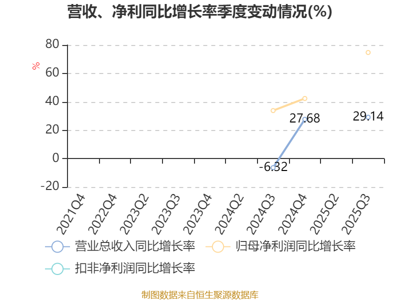 资产重大变化方面,截至2025年三季度末,公司货币资金较上年末增加509.57%,占公司总资产比重上升26.52个百分点;应收票据及应收账款较上年末增加18.9%,占公司总资产比重下降9.12个百分点;存货较上年末增加8.75%,占公司总资产比重下降6.45个百分点;在建工程合计较上年末减少65.28%,占公司总资产比重下降5.09个百分点。