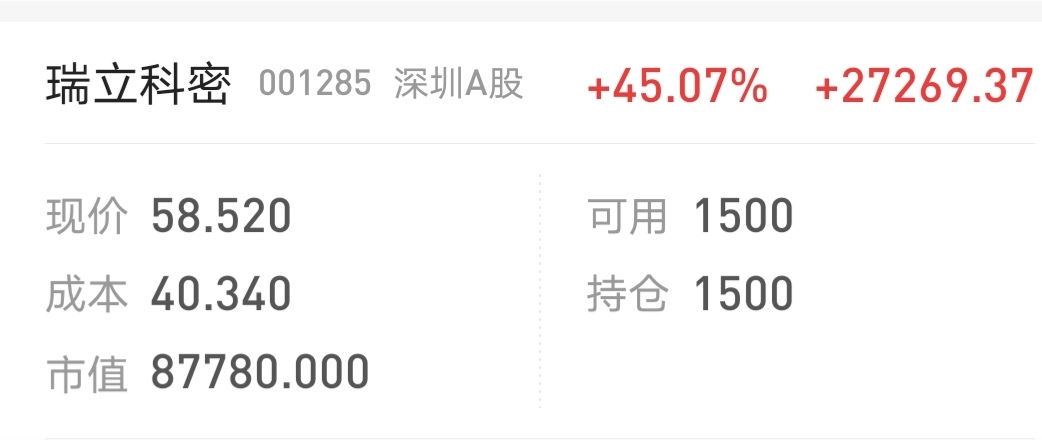 $瑞立科密(SZ001285)$ 周五和昨天买的今天出了,还留1500股。