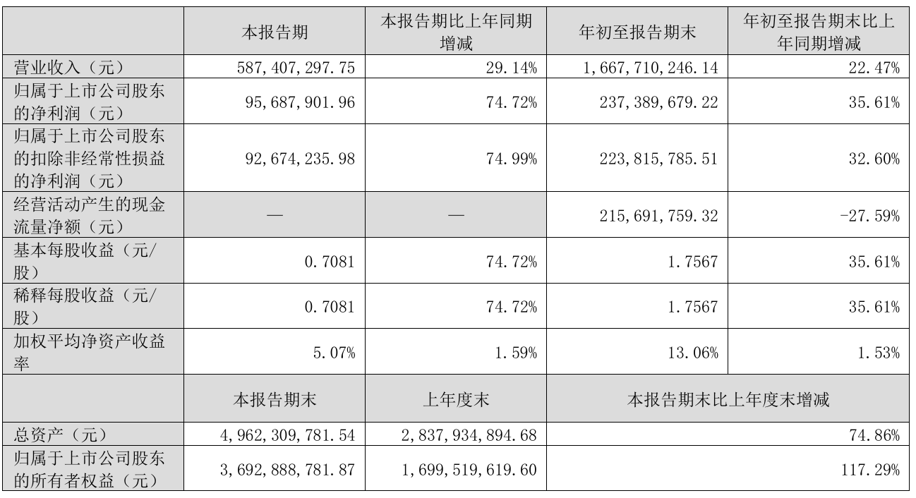2025年前三季度,公司实现营业总收入16.68亿元,同比增长22.47%;归母净利润2.37亿元,同比增长35.61%;扣非净利润2.24亿元,同比增长32.60%。
