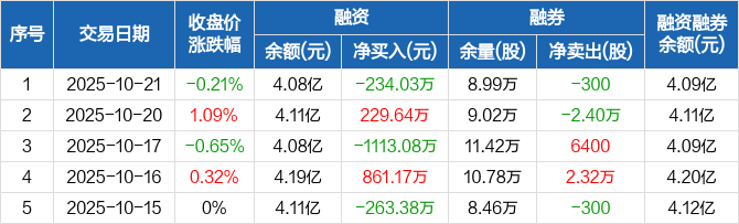 融资方面,当日融资买入945.61万元,融资偿还1179.65万元,融资净偿还234.03万元。融券方面,融券卖出0股,融券偿还300股,融券余量8.99万股,融券余额83.52万元。融资融券余额合计4.09亿元。