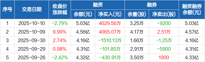融资方面,当日融资买入1.55亿元,融资偿还1.09亿元,融资净买入4629.56万元。融券方面,融券卖出800股,融券偿还1万股,融券余量3.25万股,融券余额76.9万元。融资融券余额合计5.03亿元。