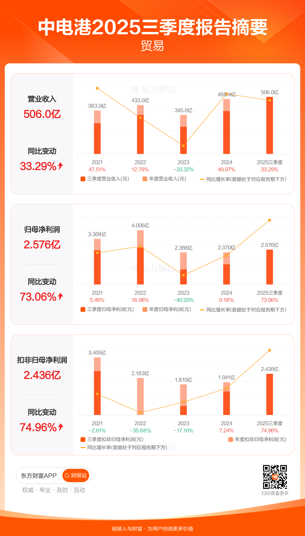 中电港10月30日发布2025年三季报显示,公司前三季实现营业收入505.98亿元,同比增长33.29%;归母净利润2.58亿元,同比增长73.06%;扣非归母净利润2.44亿元,同比增长74.96%