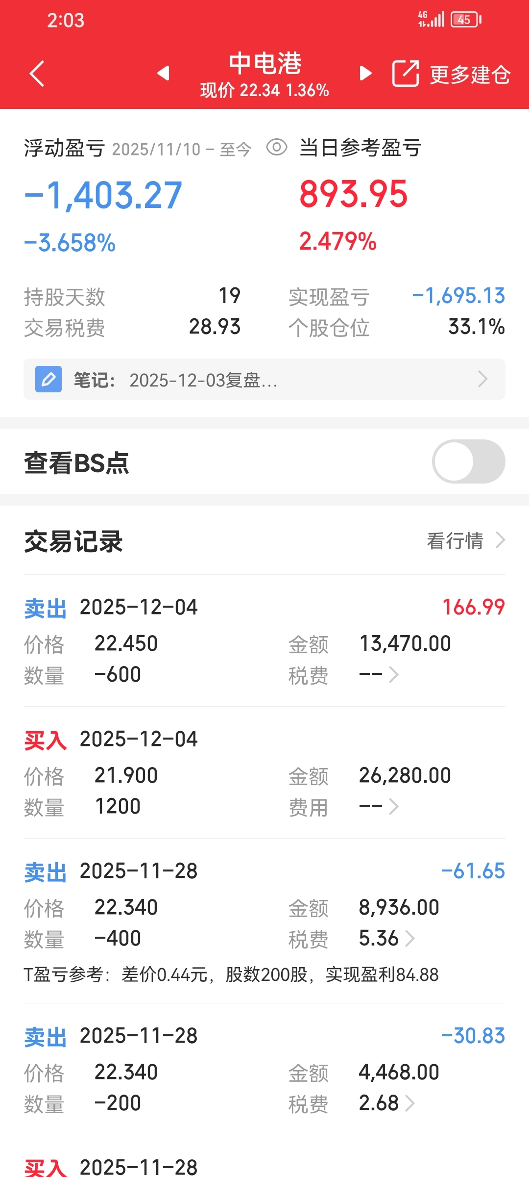 $中电港(SZ001287)$ 在21.9元接了1200股,涨了五毛,卖了600股