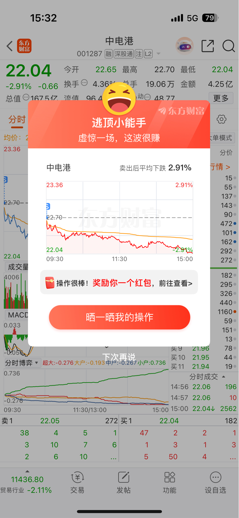 $中电港(SZ001287)$ 昨天最低点接的,今天22.70卖掉了,下午想接的,打游戏忘记了,结果收了全天最低价,打游戏能少亏钱,哈哈哈……