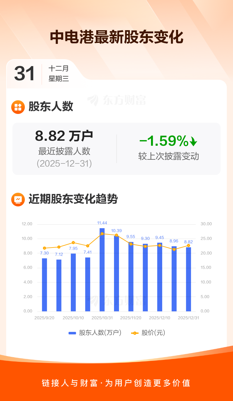 中电港最新披露数据显示,截至12月31日公司股东户数为8.82万户,较上期(2025年12月20日)减少1422户,降幅为1.59%。户均持有流通股数量由上期的4882股上升至4961股,户均持股金额由上期的10.40万元增加至11.24万元。