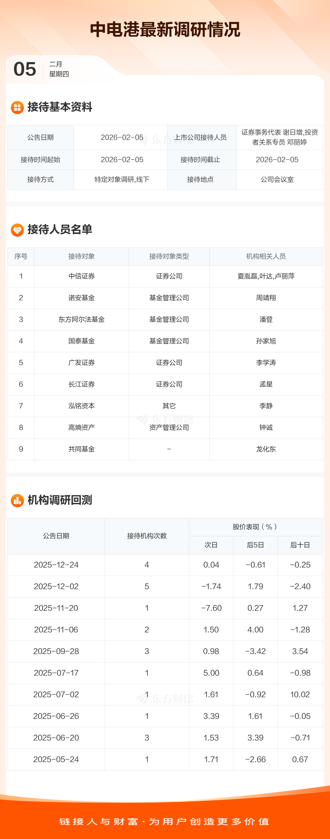 中电港2月5日公告称,2月5日接待中信证券等9家机构调研。接待人员包括证券事务代表 谢日增,投资者关系专员 邓丽婷。