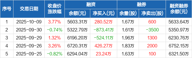融资方面,当日融资买入861.39万元,融资偿还580.87万元,融资净买入280.52万元。融券方面,融券卖出2700股,融券偿还2100股,融券余量1.67万股,融券余额30.33万元。融资融券余额合计5633.64万元。