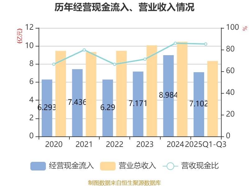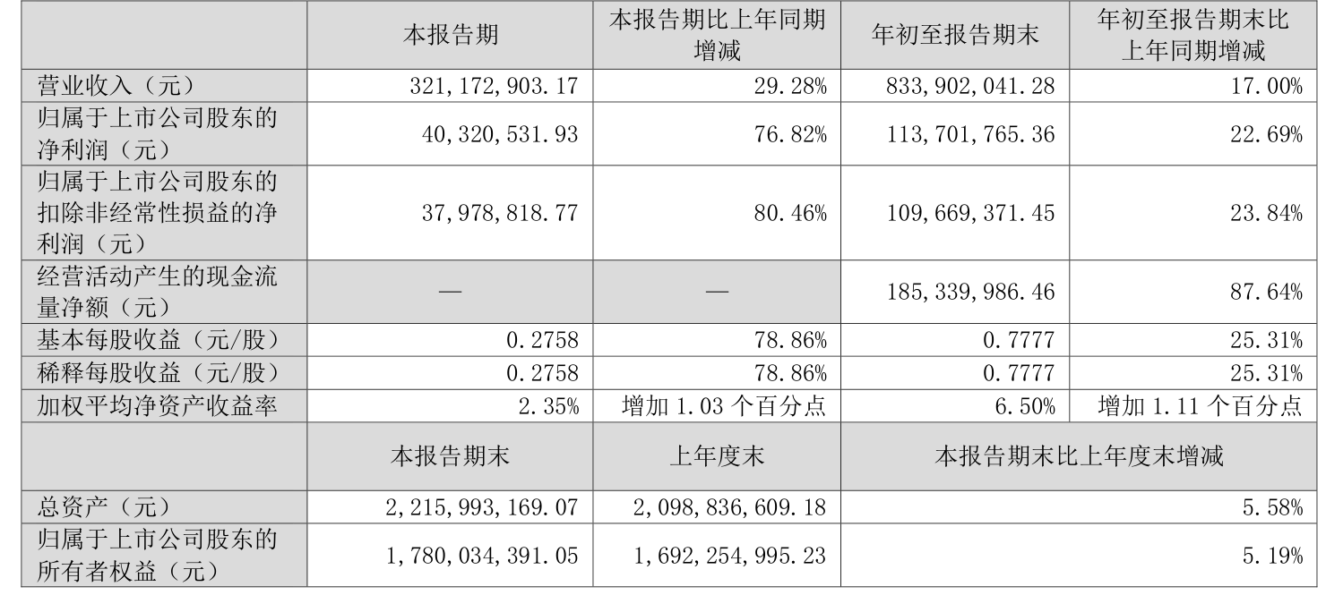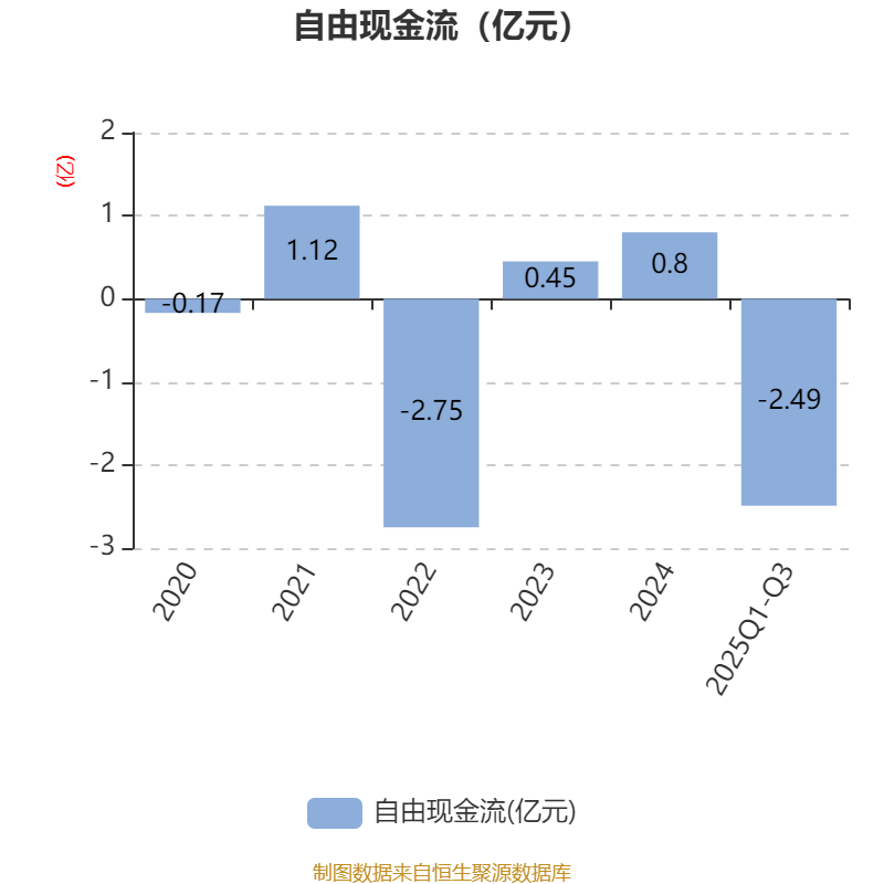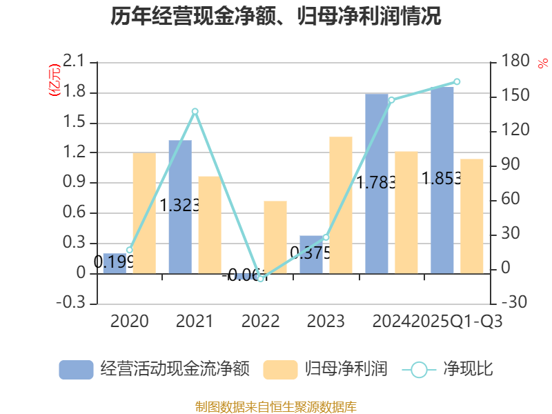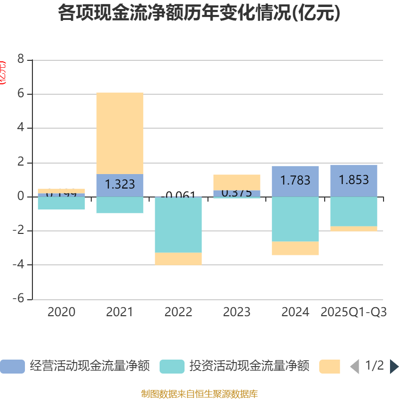 2025年前三季度,公司经营活动现金流净额为1.85亿元,同比增长87.64%;筹资活动现金流净额-2915.79万元,同比增加1738.39万元;投资活动现金流净额-1.74亿元,上年同期为-2.81亿元。