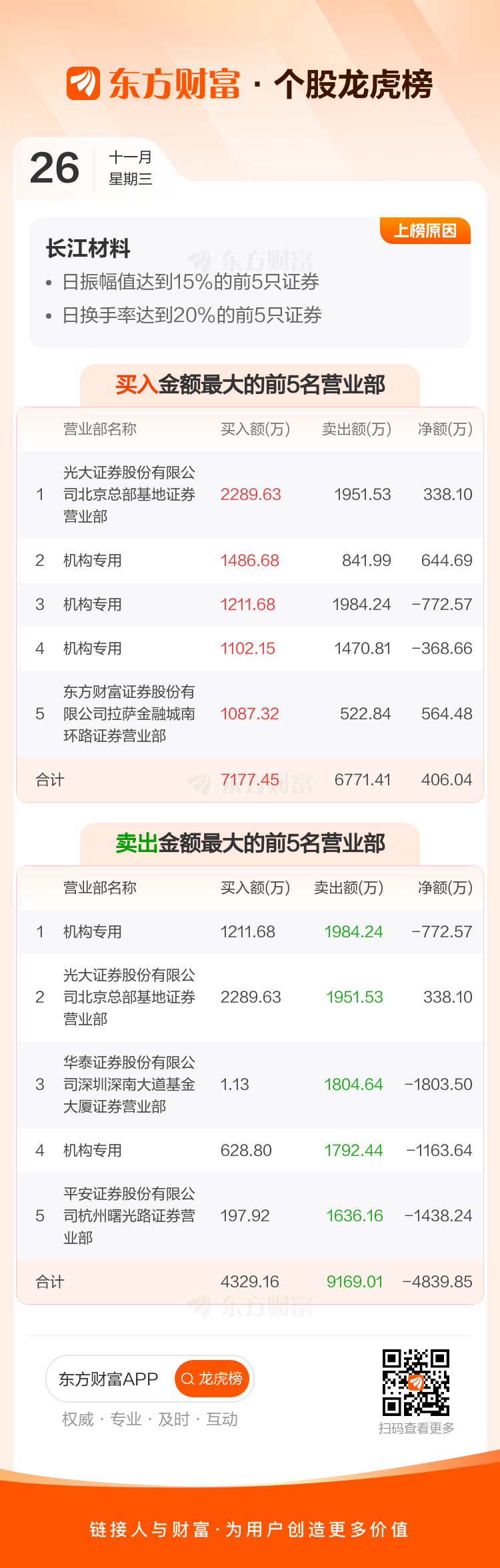 交易所2025年11月26日公布的交易公开信息显示,长江材料因成为日振幅值达到15%的前5只证券、日换手率达到20%的前5只证券上榜。长江材料当日收报28.1元,涨跌幅-8.97%,偏离值22.25%,换手率44.37%,成交额10.32亿。