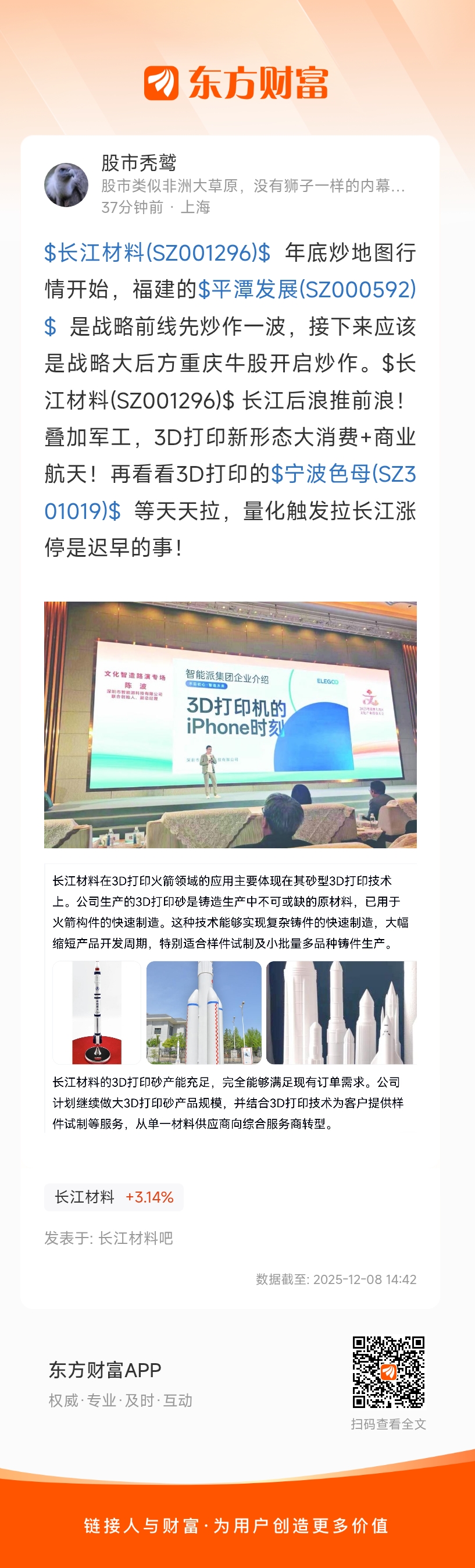 $长江材料(SZ001296)$ 年底炒地图行情开始,福建的$平潭发展(SZ000592)$ 是战略前线先炒作一波,接下来应该是战略大后方重庆牛股开启炒作。$长江材料(SZ001296)$ 长江后浪推前浪!叠加军工,3D打印新形态大消费+商业航天!再看看3D打印的$宁波色母(SZ301019)$ 等天天拉,量化触发拉长江涨停是迟早的事!