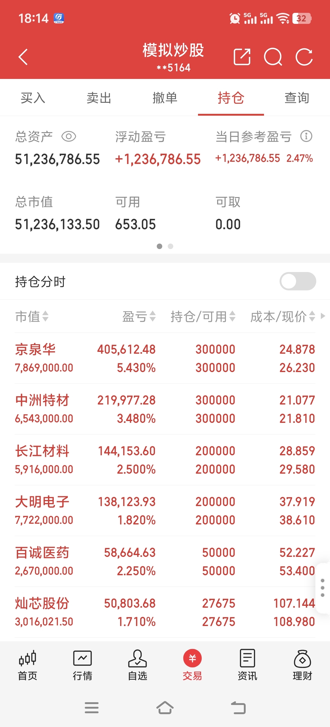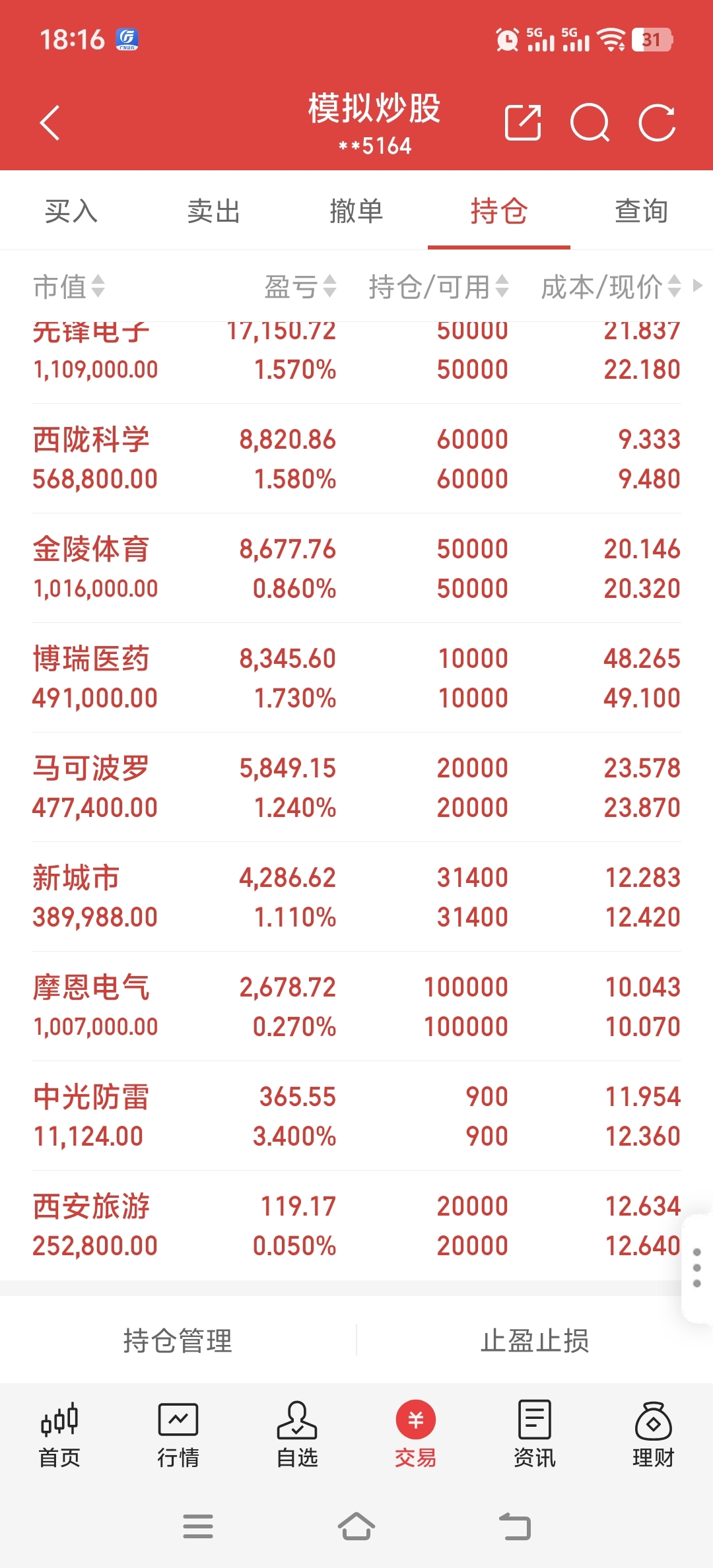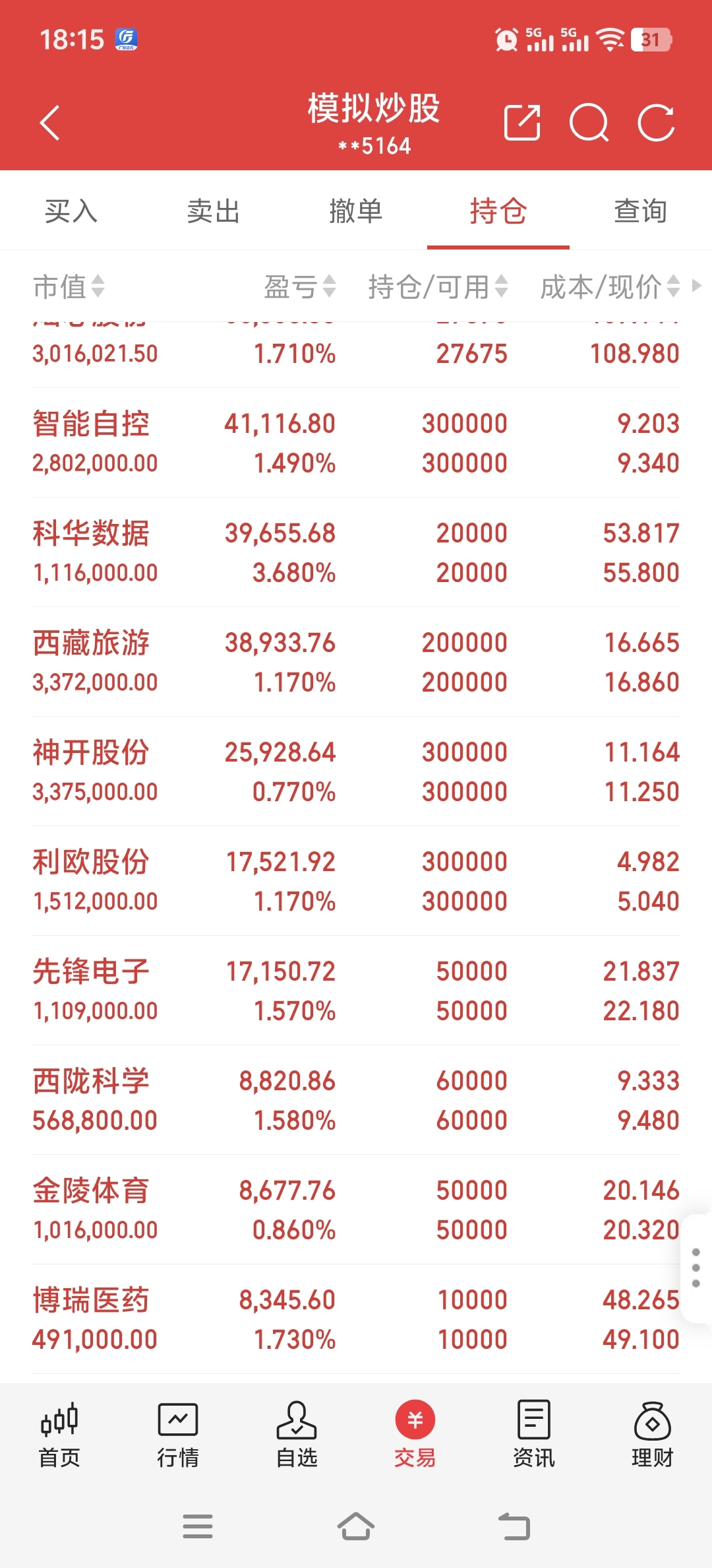 今天中午刚开的模拟账户,下午开盘一顿乱买就涨这么多,而且没有一个下跌!真正的账户
