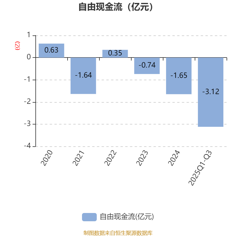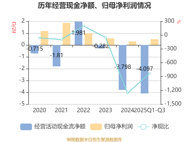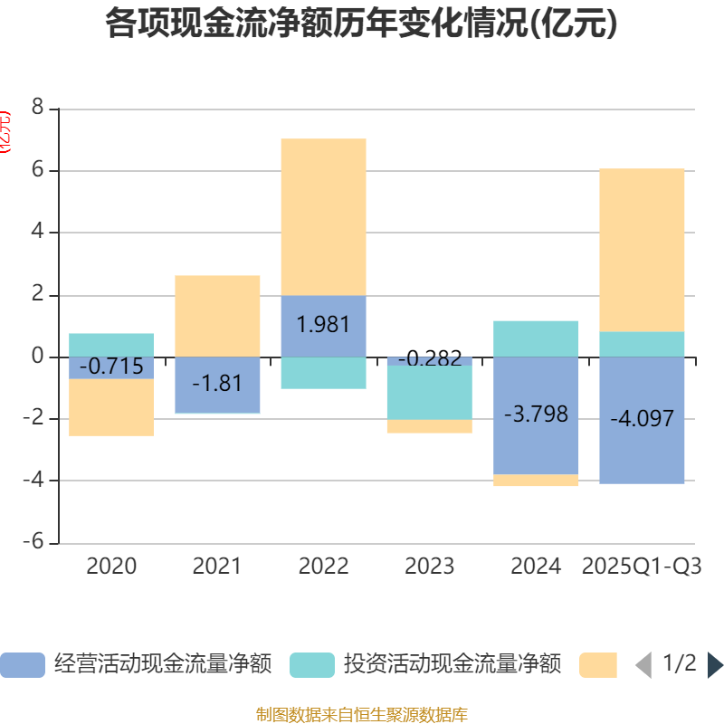 2025年前三季度,公司经营活动现金流净额为-4.1亿元,同比增加1.85亿元;筹资活动现金流净额5.25亿元,同比增加3.74亿元;投资活动现金流净额8166.26万元,上年同期为1.31亿元。