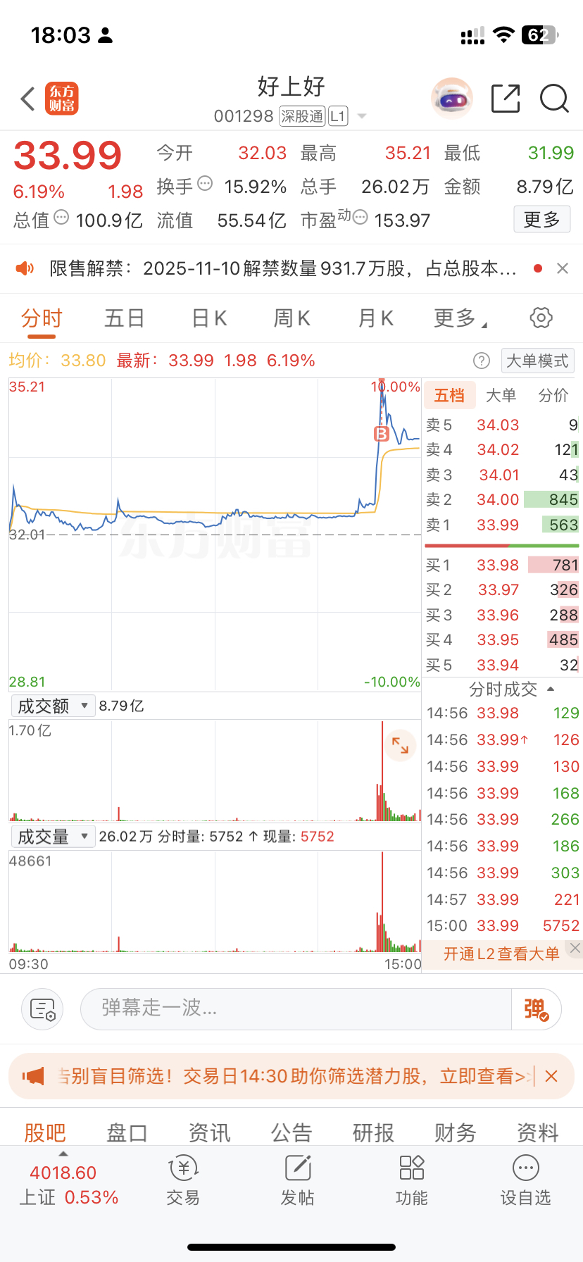 $好上好(SZ001298)$ 有板上买的兄弟吗?明天能活着出来吗?
