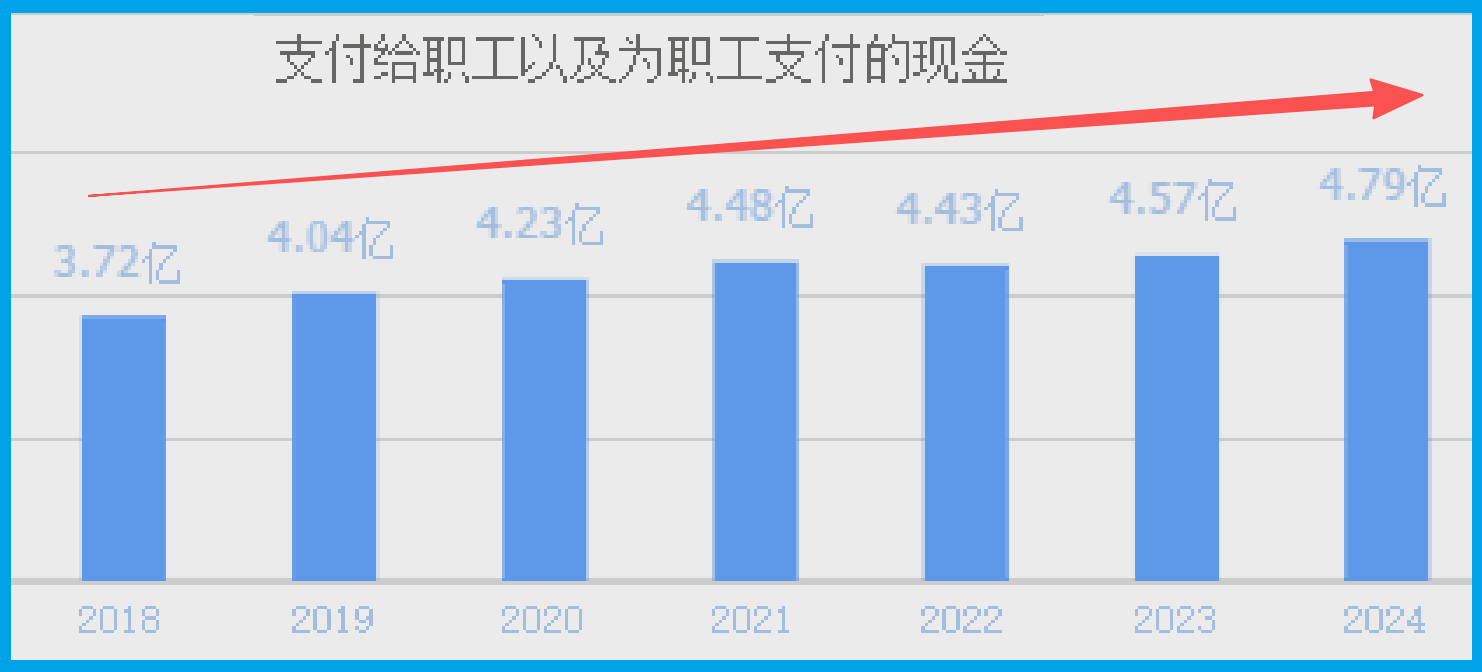带着这个疑问,财官继续深挖,又发现一个隐藏线索:为职工支付的薪酬连续多年增长,2024年更是以4.79亿元创出历史新高。