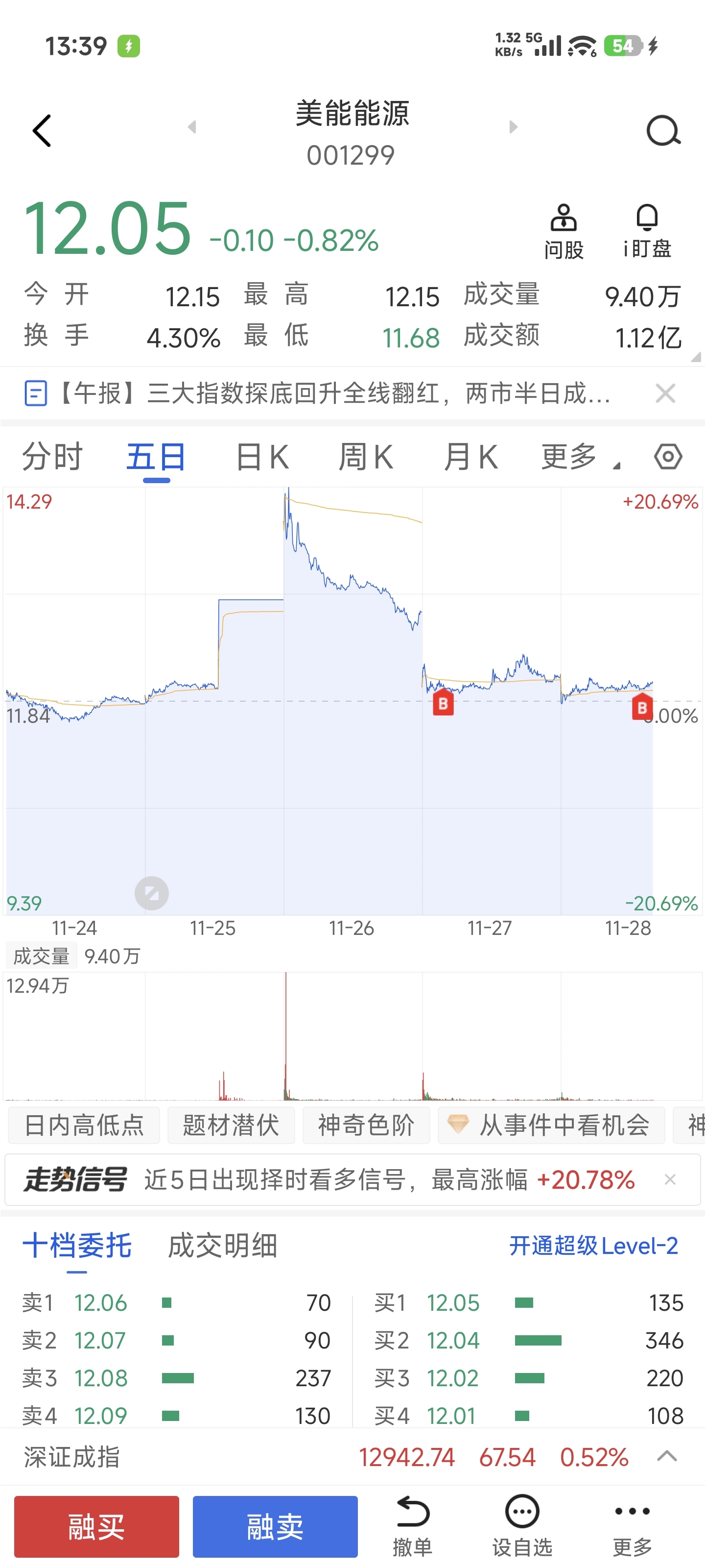 $美能能源(SZ001299)$ 昨天买一手,今天买一手,已满仓,可以涨了