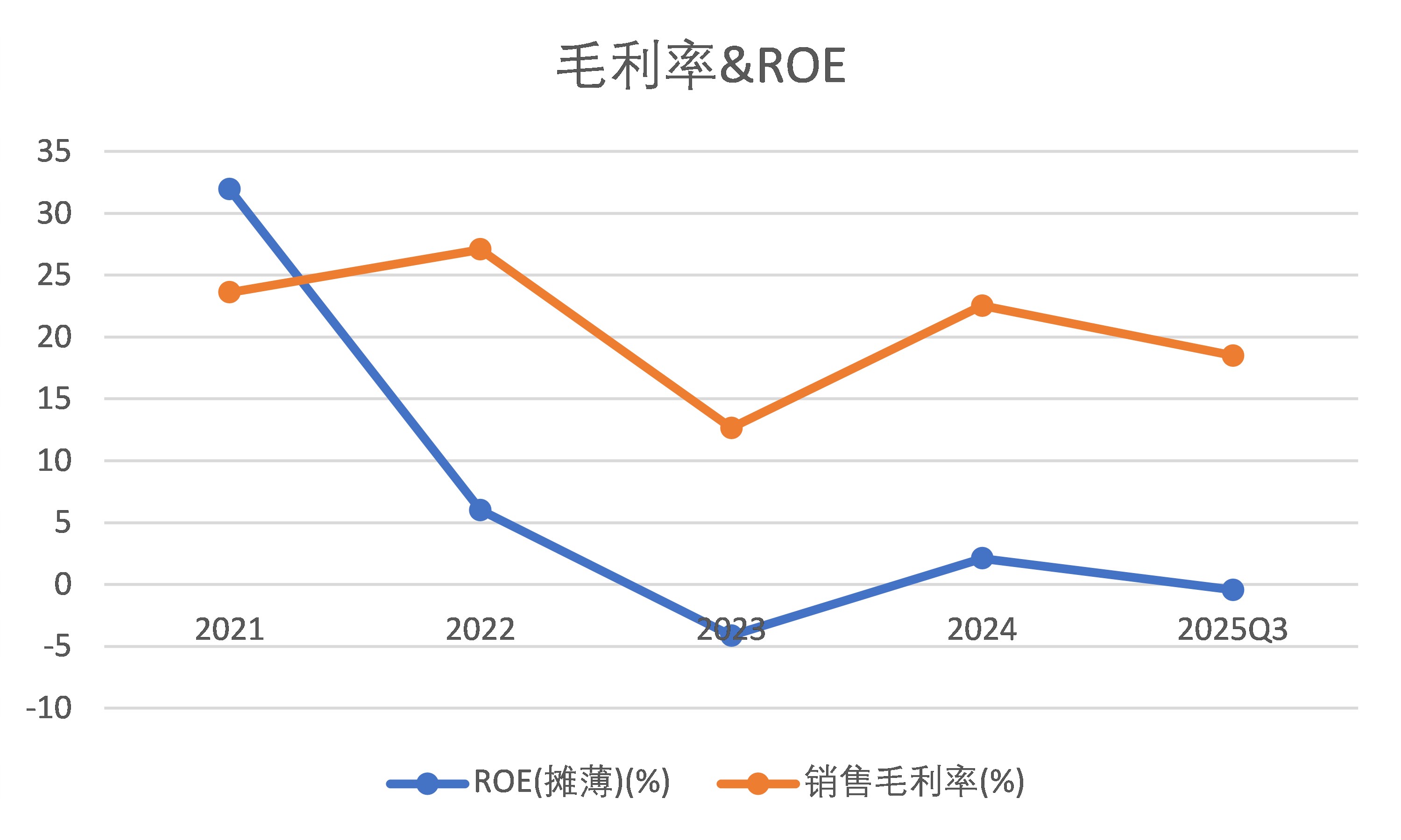 三柏硕盈利能力的恶化,还体现为核心指标全面走弱:毛利率从2019年的26.87%降至2025年三季度的18.49%,净资产收益率(ROE)从22.85%跌至-0.44%。