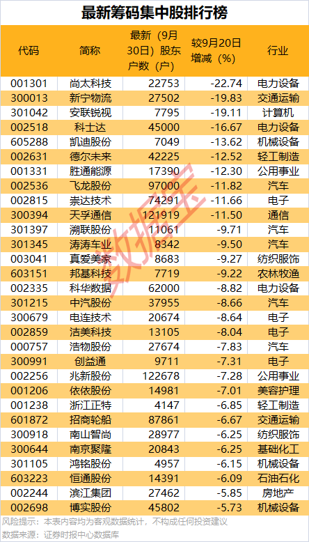 股东户数降幅最多的是尚太科技,截至9月30日最新股东户数为22753户,较9月20日下降22.74%;其次是新宁物流,截至9月30日最新股东户数为27502户,较9月20日下降19.83%。