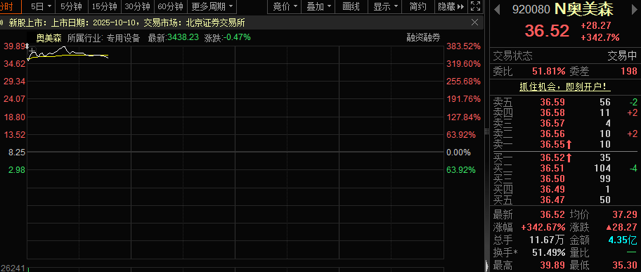 N奥美森(920080)今日在北交所上市,开盘价36.11元,上涨337.70%。