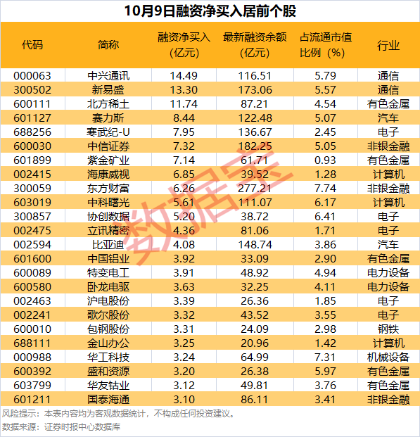 具体到个股,10月9日获融资净买入1亿元以上的有104只,其中,11股融资净买入额超5亿元。中兴通讯融资净买入额居首,当日净买入14.49亿元;其次是新易盛、北方稀土,融资净买入金额分别为13.30亿元、11.74亿元;融资净买入金额居前的还有赛力斯、寒武纪-U、中信证券等。