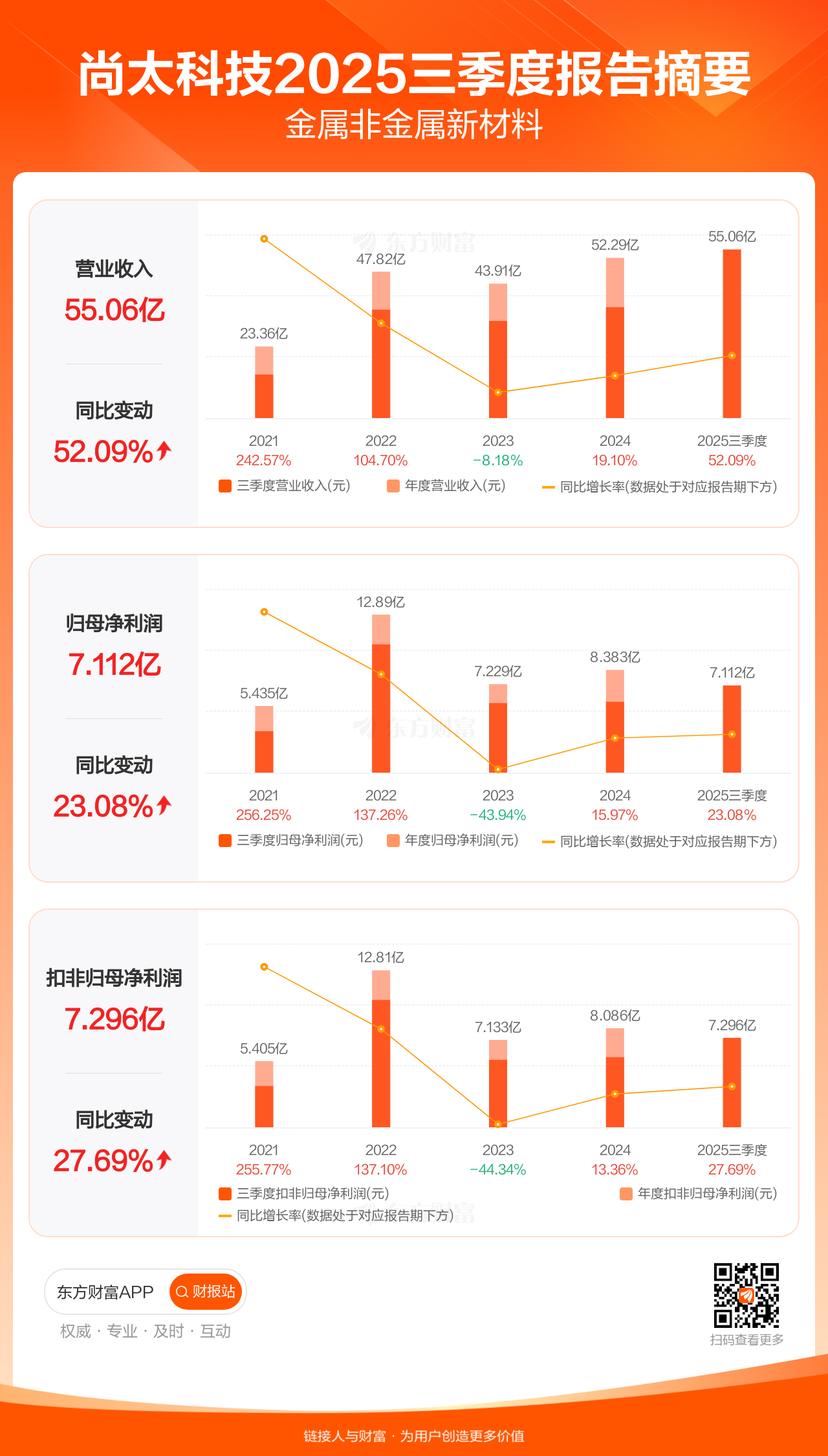 尚太科技10月28日发布2025年三季报显示,公司前三季实现营业收入55.06亿元,同比增长52.09%;归母净利润7.11亿元,同比增长23.08%;扣非归母净利润7.30亿元,同比增长27.69%。