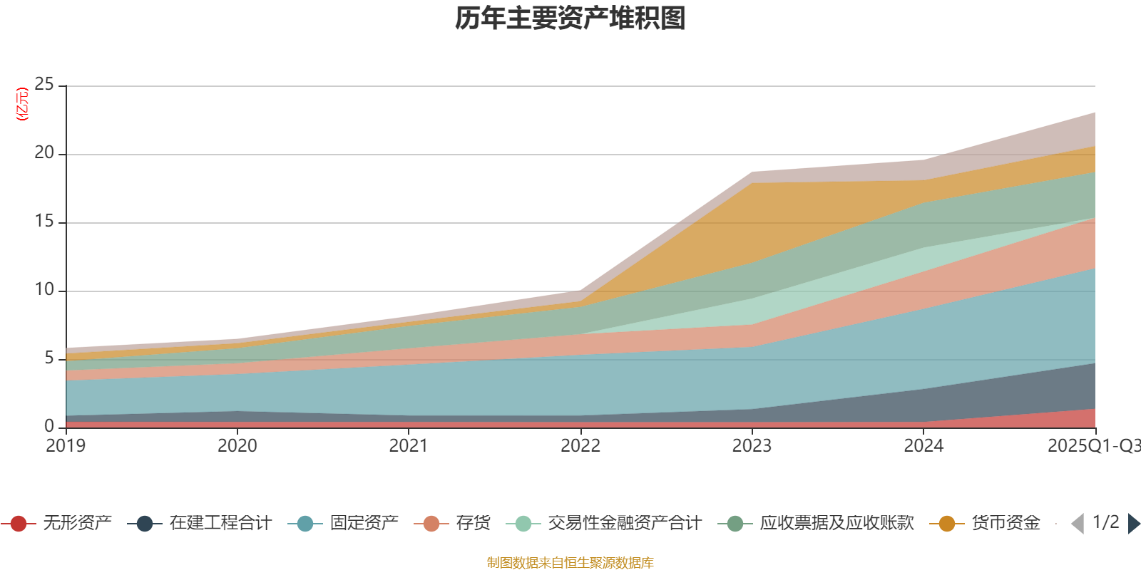 资产重大变化方面,截至2025年三季度末,公司交易性金融资产合计较上年末减少99.89%,占公司总资产比重下降8.96个百分点;无形资产较上年末增加236.45%,占公司总资产比重上升3.87个百分点;应收票据及应收账款较上年末增加1.81%,占公司总资产比重下降2.27个百分点;在建工程合计较上年末增加38.29%,占公司总资产比重上升2.14个百分点。