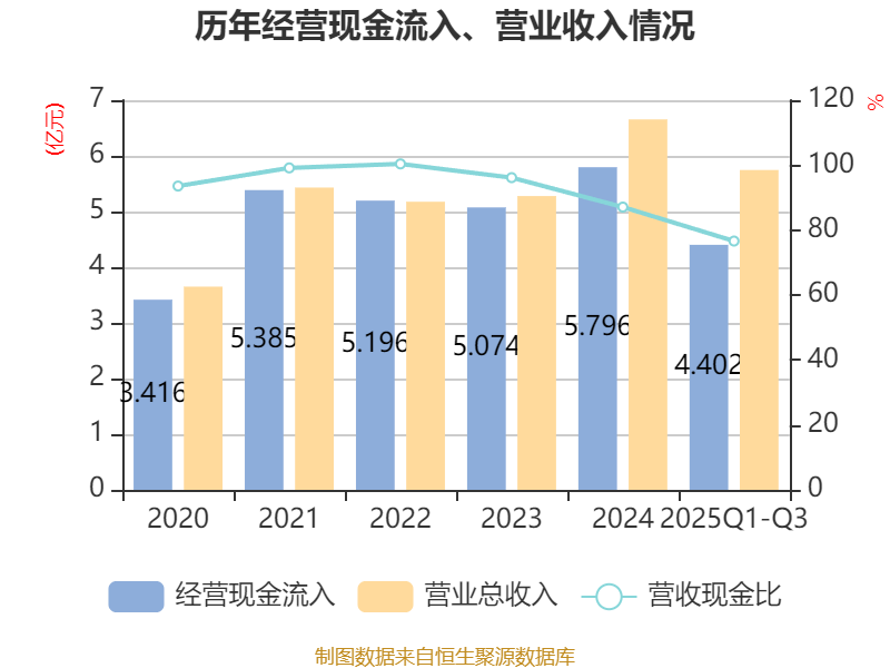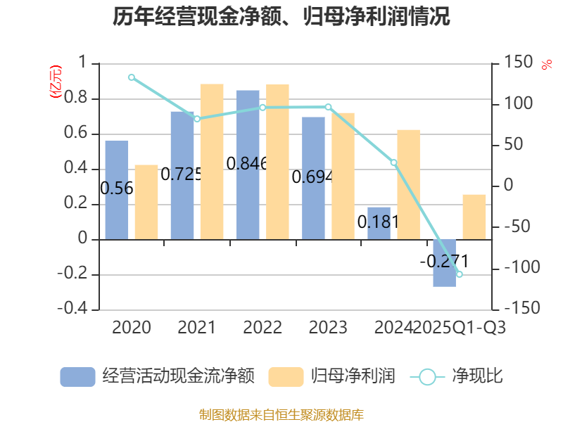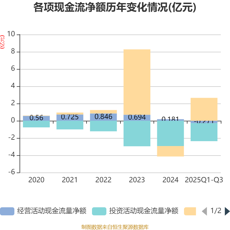 2025年前三季度,公司经营活动现金流净额为-2708.72万元,同比减少3056.91万元;筹资活动现金流净额2.65亿元,同比增加3.81亿元;投资活动现金流净额-2.1亿元,上年同期为-2.31亿元。