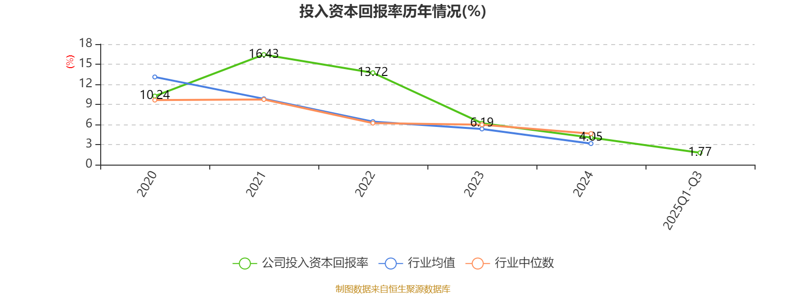 公司2025年前三季度投入资本回报率为1.77%,较上年同期下降1.35个百分点。