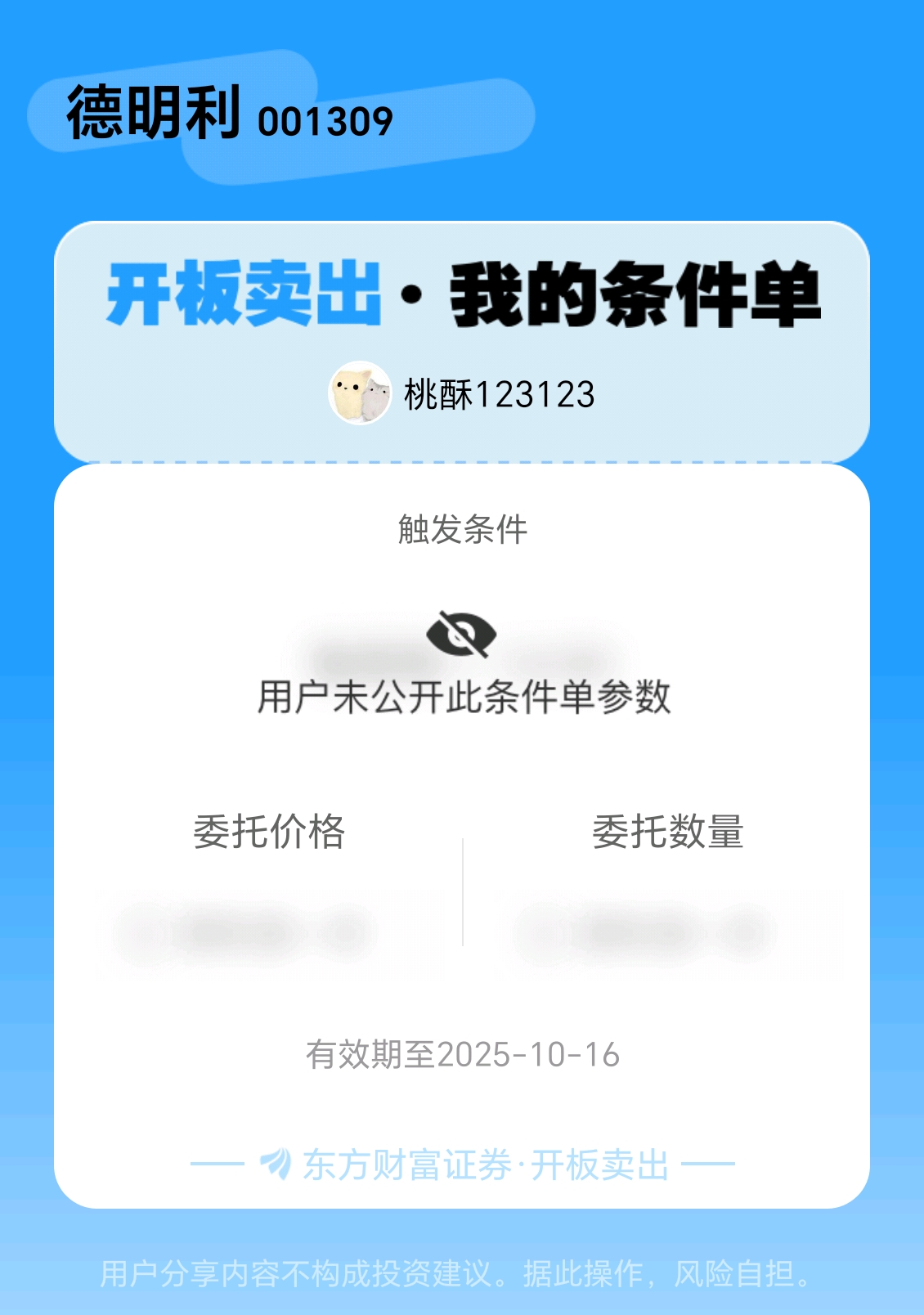 #条件单交流# #开板卖出晒单# 一位股神设置了一个开板卖出条件单,接下来就是见证奇迹的时刻~$德明利(SZ001309)$