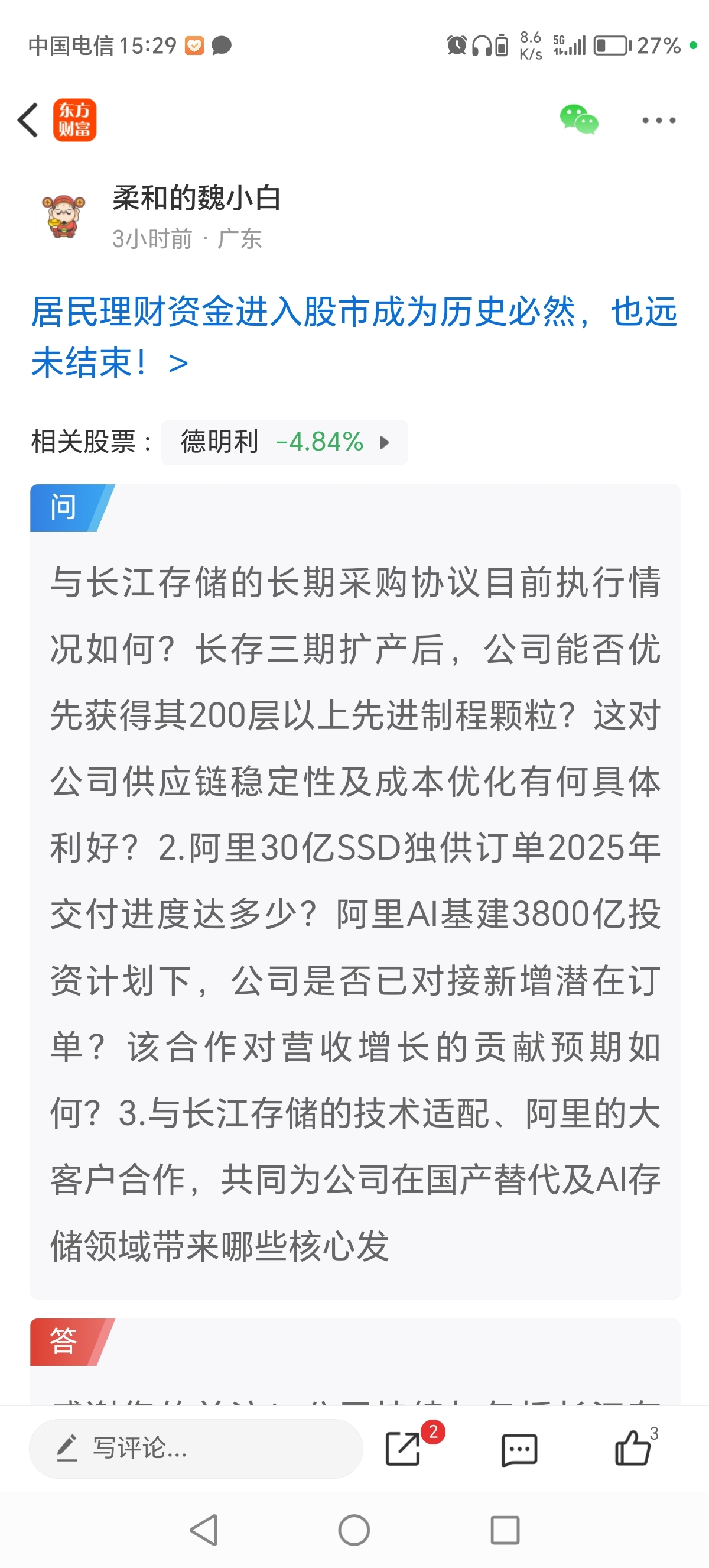 你们最关心的问题懂秘已经回复我了,和长江存储有深度合作关系