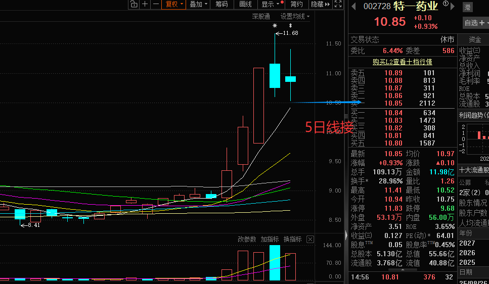 特一药业:2025年上半年公司归母净利润同比暴增1164%-1313%,营收增速超200%,毛利率提升至55%以上。核心产品止咳宝片销量激增300%,贡献超70%利润,叠加中药配方颗粒业务收入突破2亿元,成为新的增长极快。特一药业经过两天获利盘的吐出与整理后,整体走势还是很强,老k认为今天5日线附近会有低吸的机会,毕竟周末流感不断,它的成交量很强,所以这个方向值得大家重点观察。
