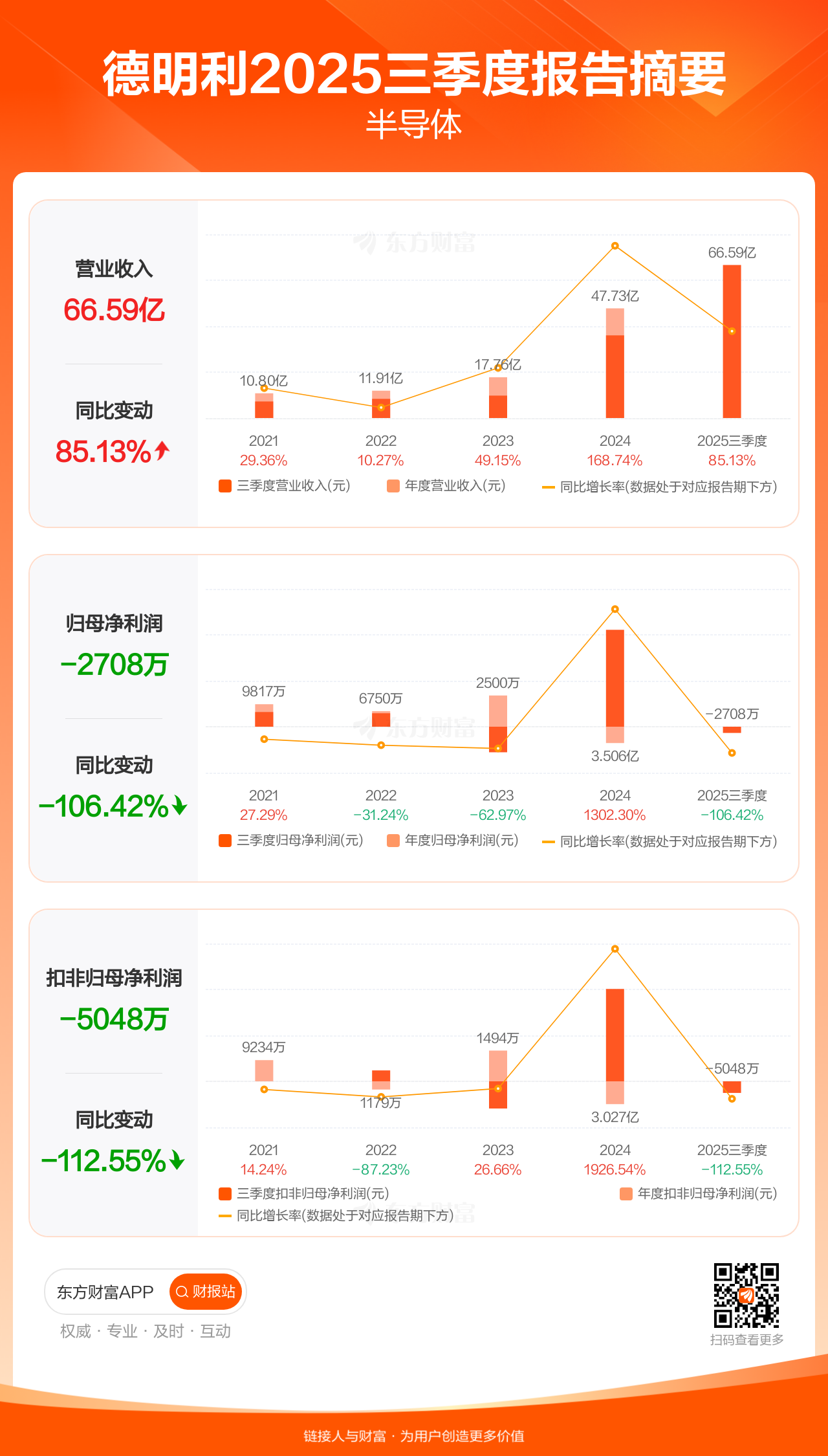 德明利10月31日发布2025年三季报显示,公司前三季实现营业收入66.59亿元,同比增长85.13%;归母净利润-2707.65万元;扣非归母净利润-5048.16万元。