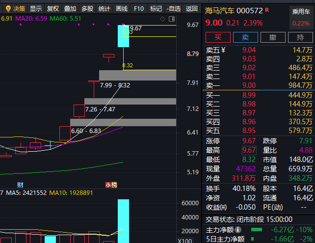 $海马汽车(SZ000572)$:马年炒作叠加海南自贸双重热点,5板炸板爆历史天量,常态周五看跌,主力在此产生很大分歧,当前就依托今天K线做文章即可:一是向下回踩不破今天的最低点8.32可低吸,破8.32放弃跟踪;二是过9.33激进者可小仓位打底仓,反包9.67继续加仓。