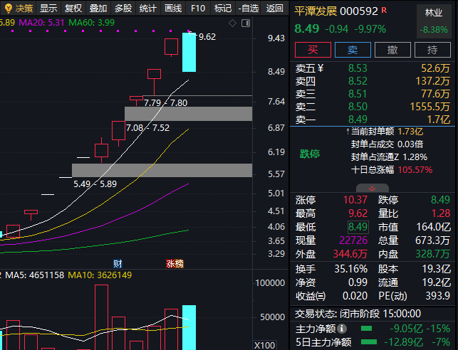 $平潭发展(SZ000592)$:龙头首阴,也是当前最聚辨识度的高标之一,从量能上分析今天并未出现天量,相对于10月30号还是缩量,还有资金在博弈;三种应对方案:一是明天高开,且有效站稳9元则有反包预期,二是开盘如果之接往跌停按,那就放弃操作,三是低开后快速拉升且能够有效站在5天均线上方,计划轻仓在博弈一笔,最坏的结果就是利润回吐。