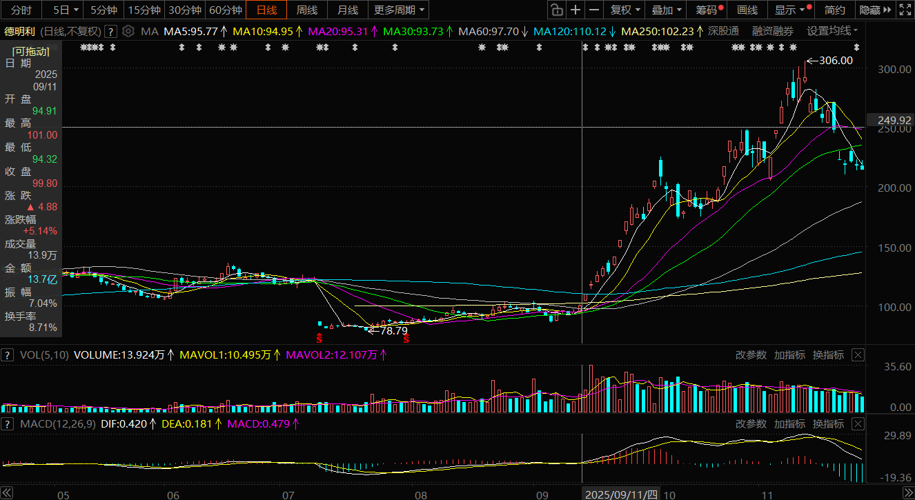 二级市场上,德明利9月至11月股价涨幅明显。9月11日至11月13日期间,该股涨幅达207.66%,股价一度突破306元/股,最新股价(不复权)较发行价26.54元/股已有超过7倍的上涨。