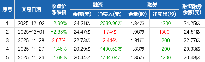 德明利:融资净偿还2639.96万元,融资余额24.21亿元(12-02)