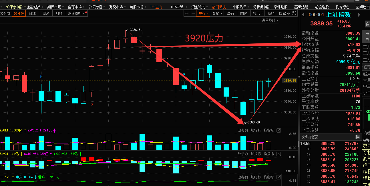 今天的盘面太痛快了!昨晚M谷新高,加上昨天冰点的修复预期,今天大涨的局面尘埃落定,竞价的时候G股那边已经大涨,果然一片红才是解锁周末的正确方式,今天盘面普反,多个板块轮动上涨,全市场超3200只个股上涨,83只个股涨停,全天成交额达20922亿元,较前一交易日放量约2350亿元,快乐氛围拉满,上证的60分钟走势来说,应该回冲击3920的颈线位置。