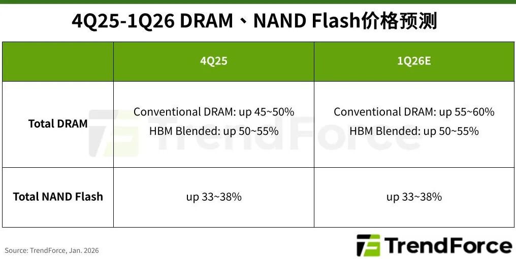 涨势持续,Trend Force预测,2026年第一季度,DRAM和NAND闪存价格,有望环比上涨60%、38%。