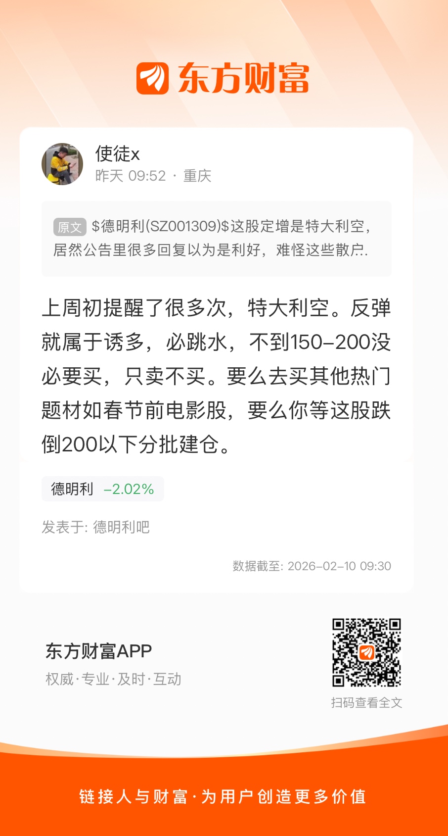 温馨提示: 1.根据《证券法》规定,禁止编造、传播虚假信息或者误导性信息,扰乱证券市场;2.用户在本社区发表的所有资料、言论等仅代表个人观点,与本网站立场无关,不对您构成任何投资建议。用户应基于自己的独立判断,自行决定证券投资并承担相应风险。《东方财富社区管理规定》
