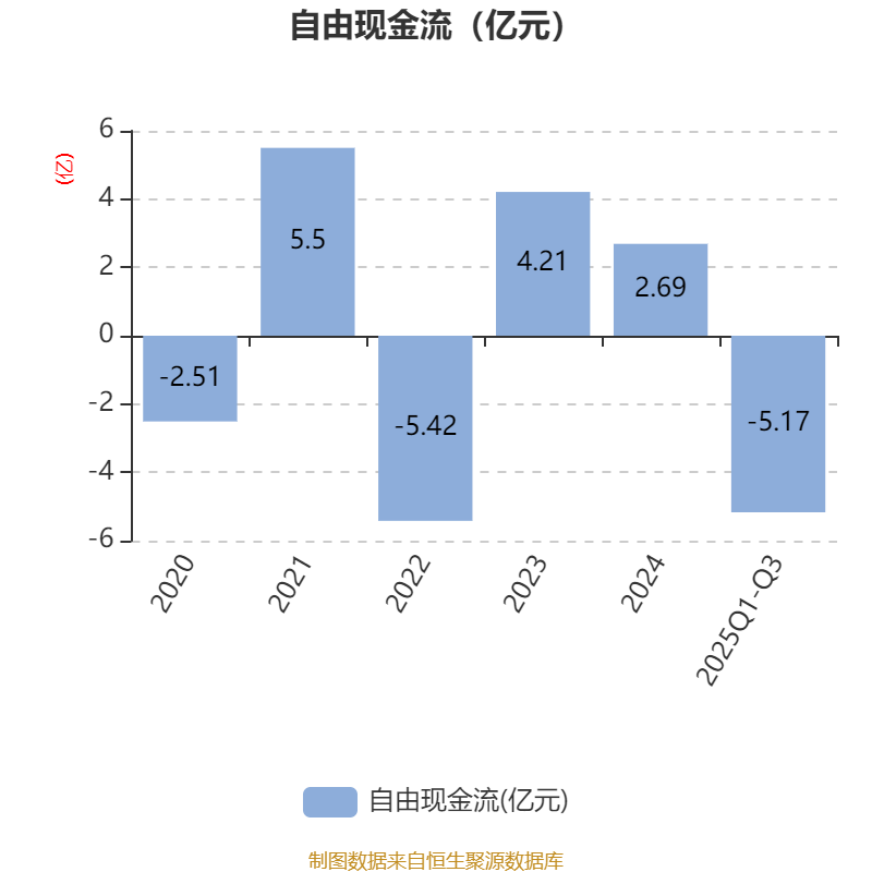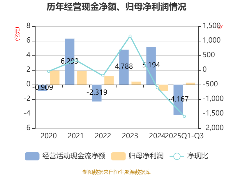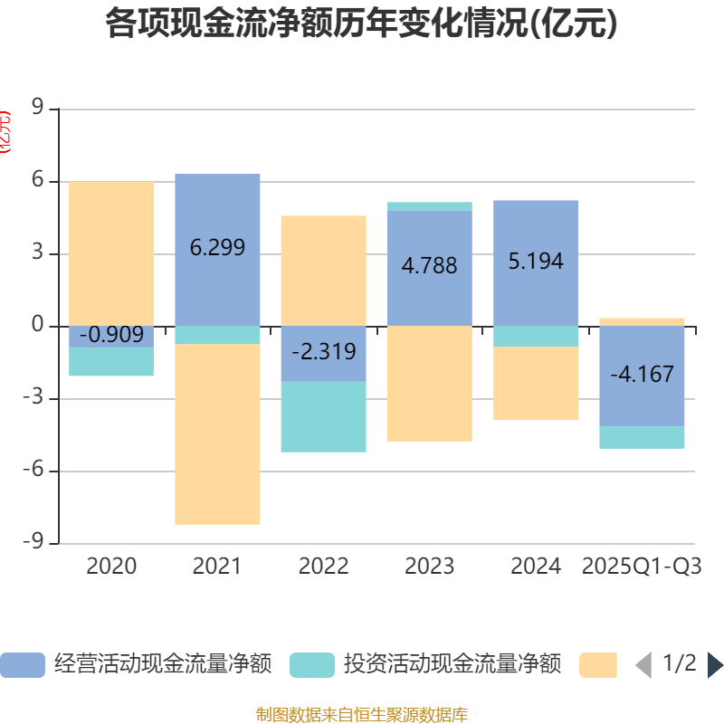 2025年前三季度,公司经营活动现金流净额为-4.17亿元,同比减少1.22亿元;筹资活动现金流净额3183.54万元,同比增加1.18亿元;投资活动现金流净额-9284.7万元,上年同期为-2.03亿元。