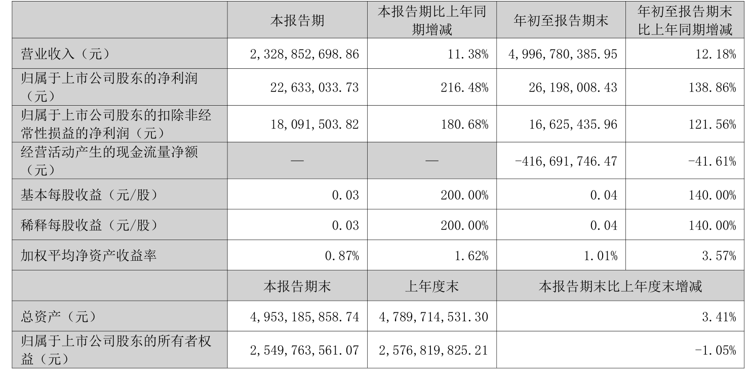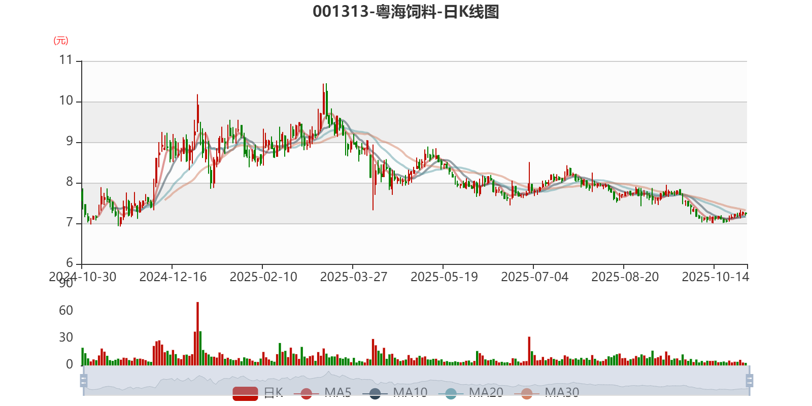 中证智能财讯粤海饲料(001313)10月30日披露2025年第三季度报告。前三季度公司实现营业总收入49.97亿元,同比增长12.18%;归母净利润2619.8万元,同比扭亏;扣非净利润1662.54万元,同比扭亏;经营活动产生的现金流量净额为-4.17亿元,上年同期为-2.94亿元;报告期内,粤海饲料基本每股收益为0.04元,加权平均净资产收益率为1.01%。