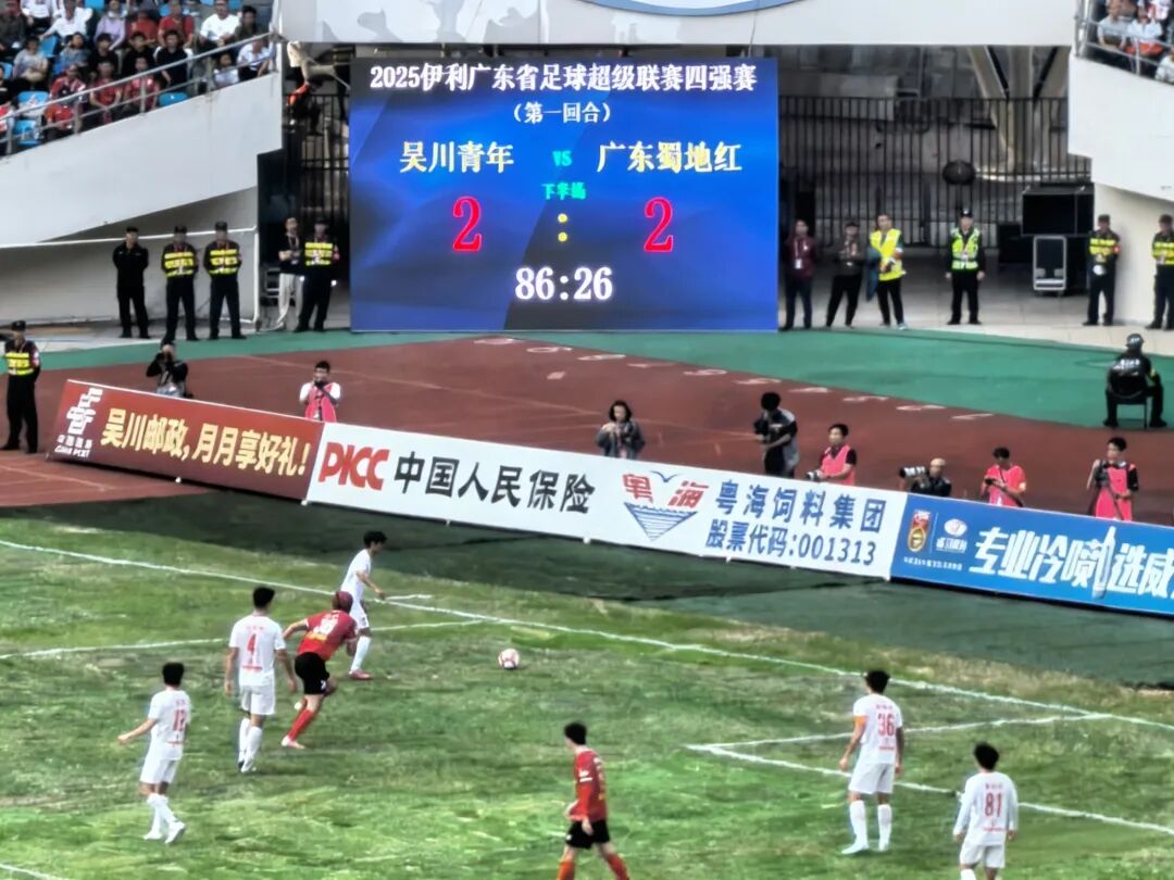 本场比赛由湛江本土劲旅吴川青年队主场迎战上届亚军广东蜀地红队。面对实力强劲的对手,吴川青年队展现出顽强拼搏的精神,在两球落后的情况下连追两球,最终以2:2的比分逼平强敌,赢得全场观众热烈掌声。