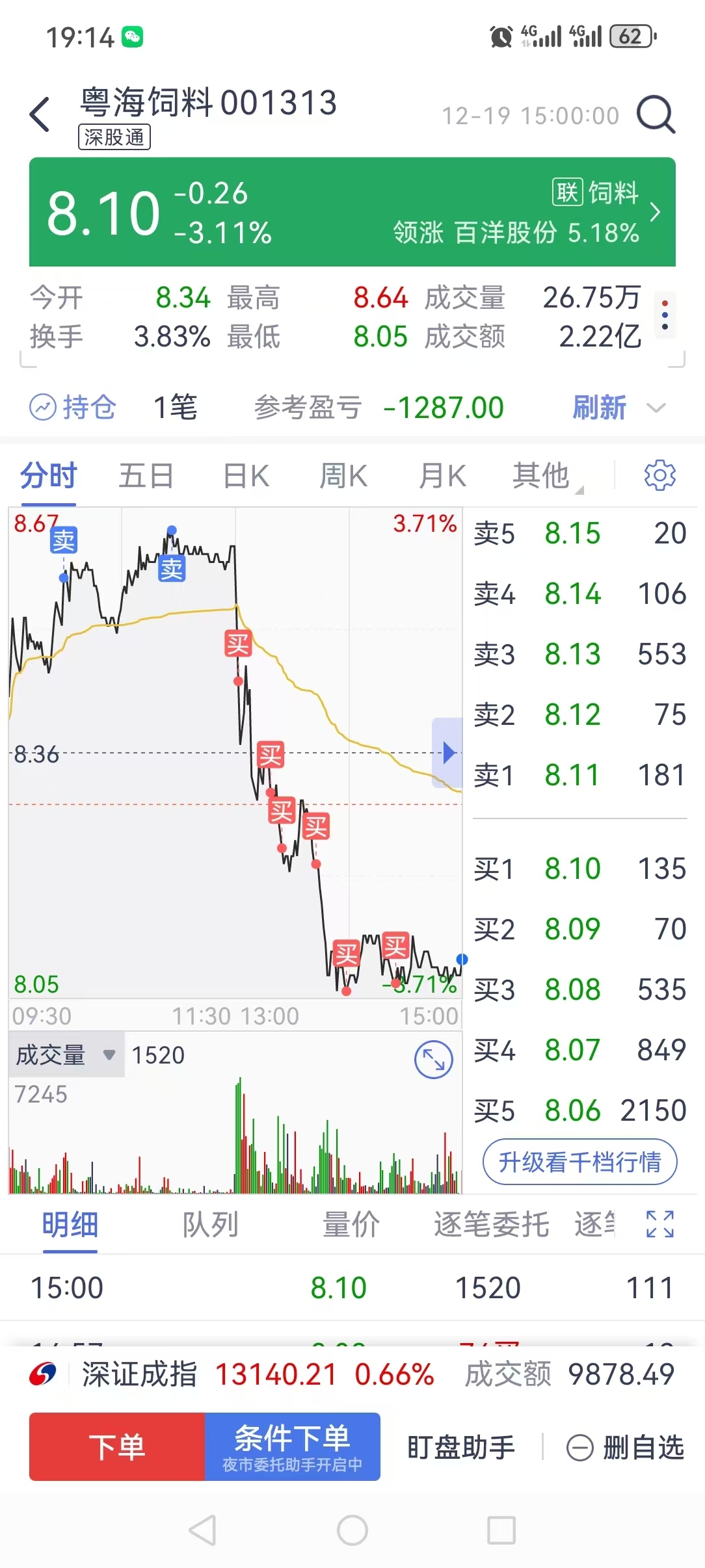 $粤海饲料(SZ001313)$ 搏一搏单车变摩托, 星期五做T买进来的,亏了2个多点,就是为了赌今天上涨,能看火箭升天