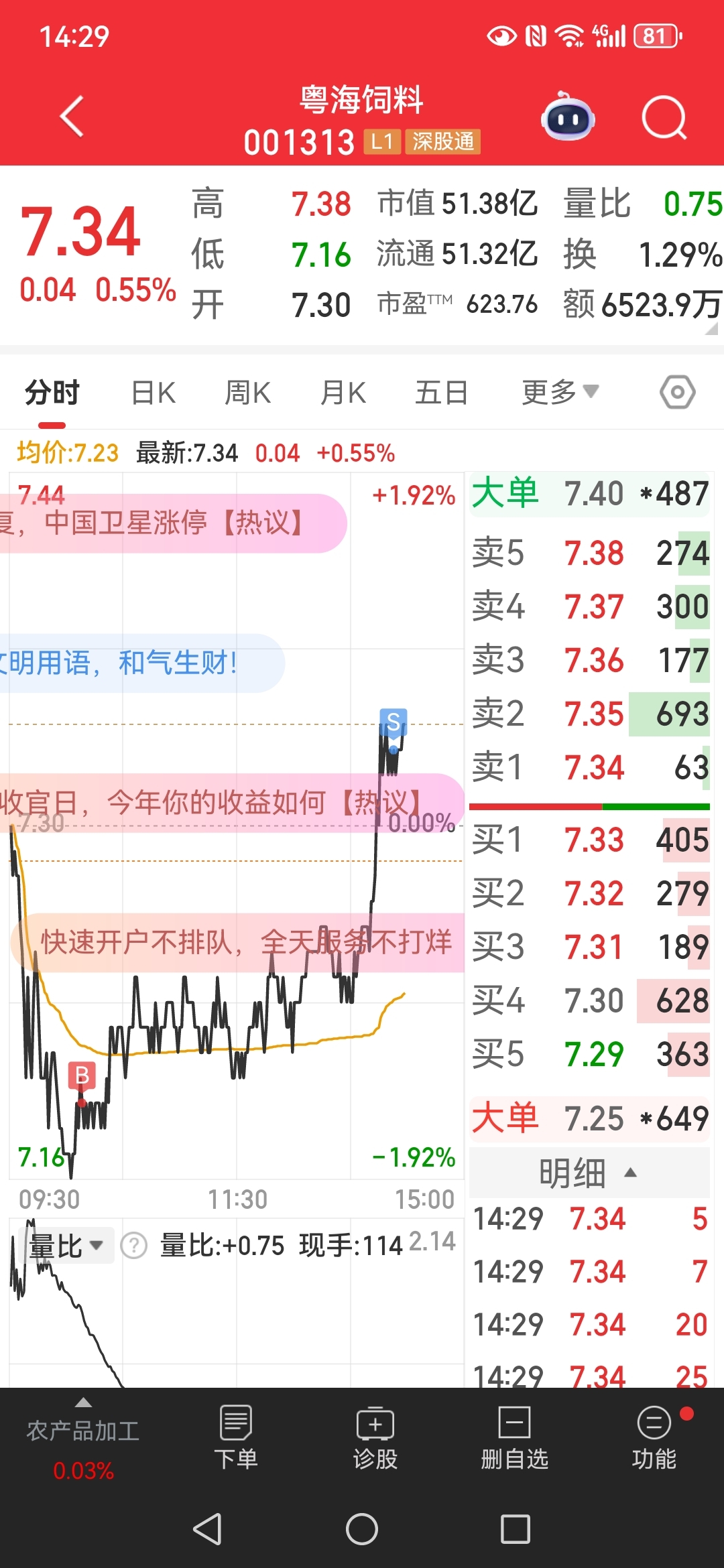 $粤海饲料(SZ001313)$ 帐户红了,一分也是肉!哈哈!