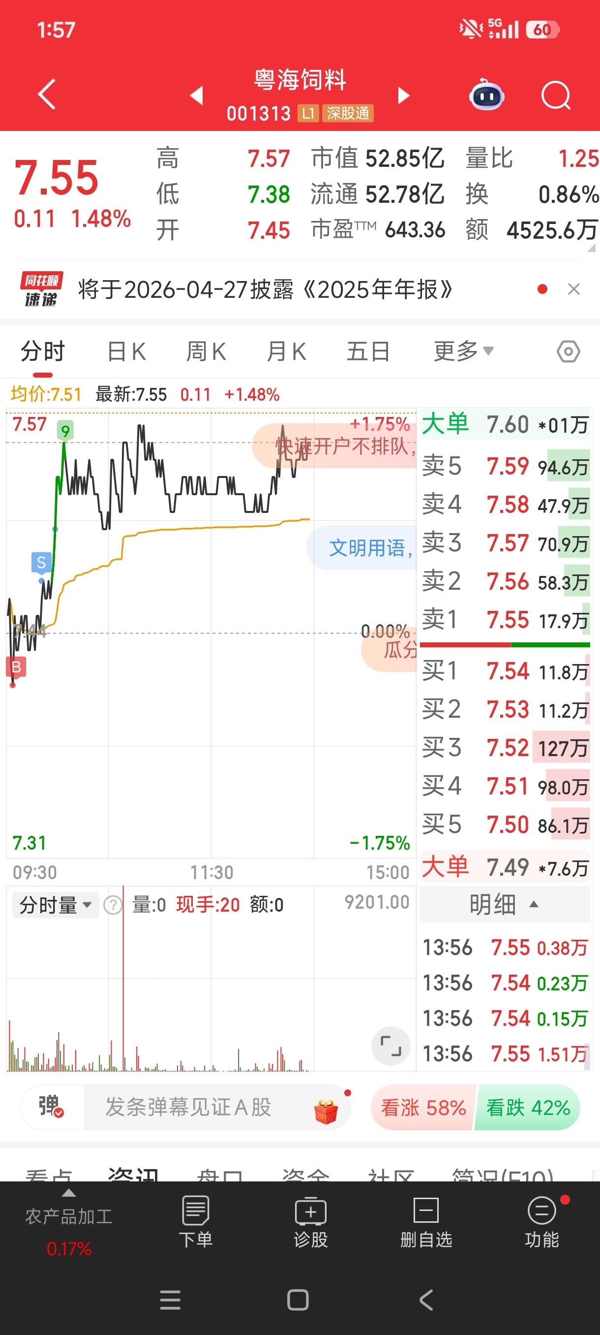 $粤海饲料(SZ001313)$ 7.4买了半仓,7.48,7.5卖了昨天买的半仓,卖飞了